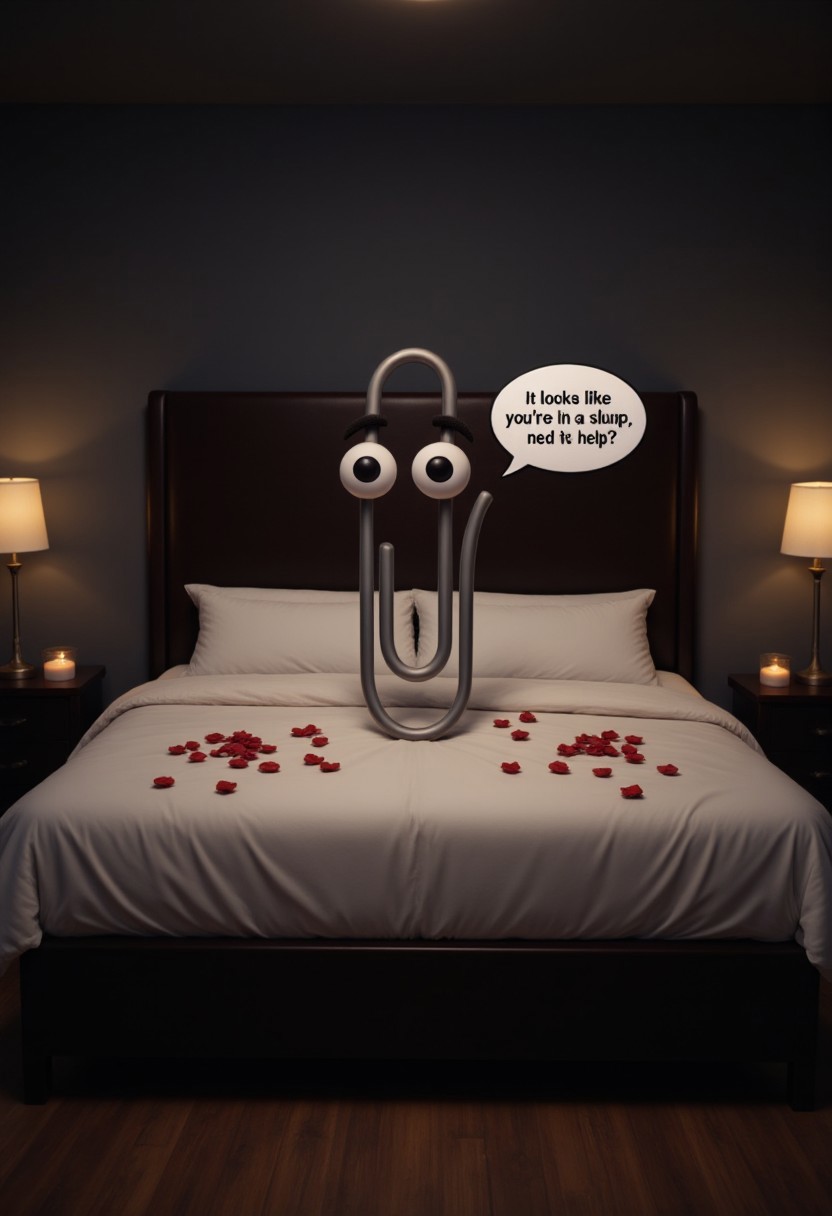 a dark, romantic bedroom, king sized bed. there's clippy looking at you with bedroom eyes in the center, rose petals around, small candles. cinematic lighting. speech bubble saying "It looks like you're in a slump, need some help?"