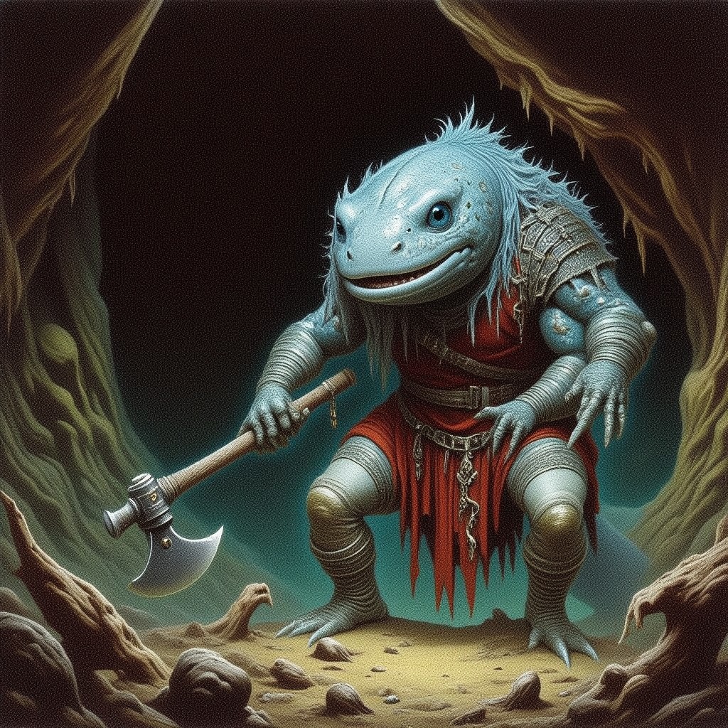 DnD_Grainyboyz, noise, grainy, 1970’s dark fantasy artwork, axolotl barbarian wielding a large battle-axe in a cavern