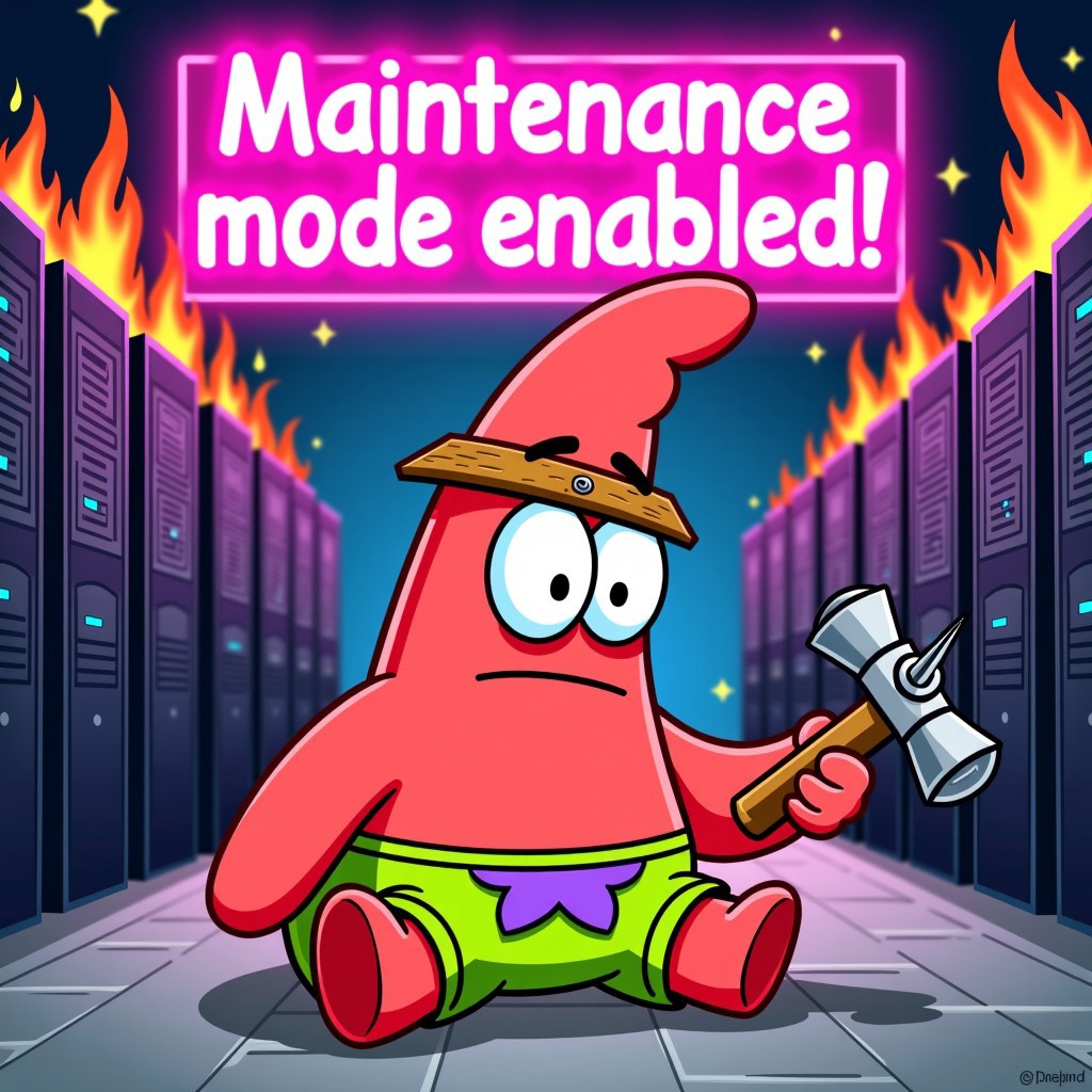 Patrick Star sitting on the floor with a hammer in his hand. Patrick has a wooden board attached to his forehead with a large nail. Looking away from the viewer with a blank expression. Behind Patrick is a room full of computer servers on fire with. A giant neon sign above everything saying "Maintenance mode enabled!". Drawn in the style of the cartoon show SpongeBob SquarePants. detailmaximizer