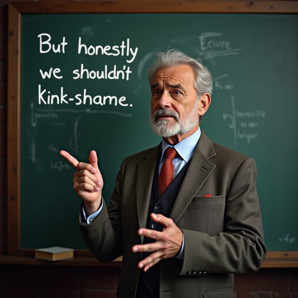 A contrite 35 years old distinguished man holding a pointer standing in front of a chalkboard that says "But honestly we shouldn't kink-shame"