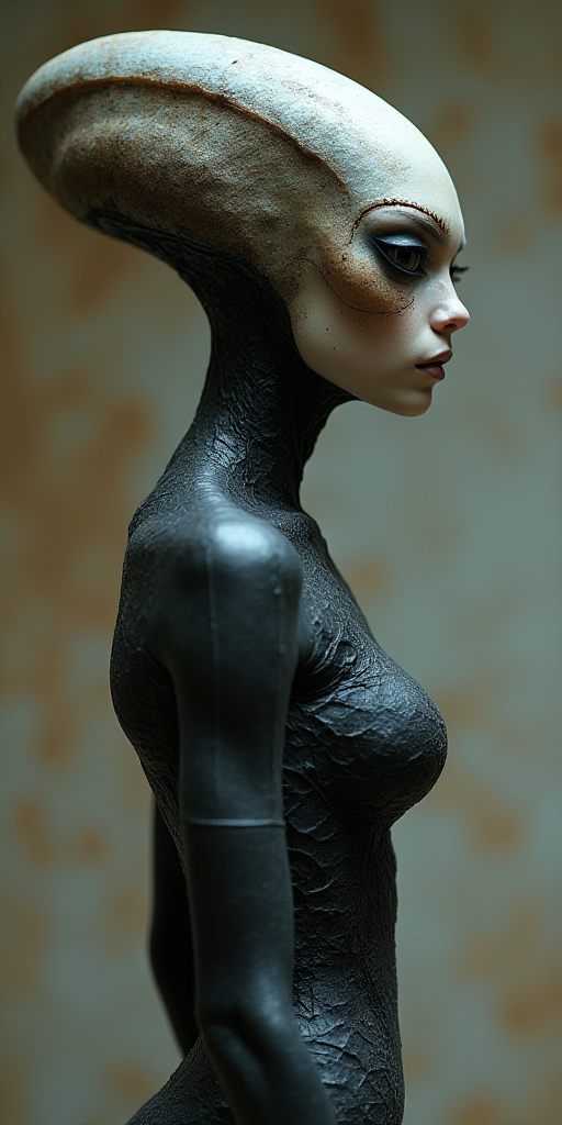 Side profile view of a slender female human like alien, wearing futuristic bodysuit, exotic eyes and face, textured skin, big black eyes.
