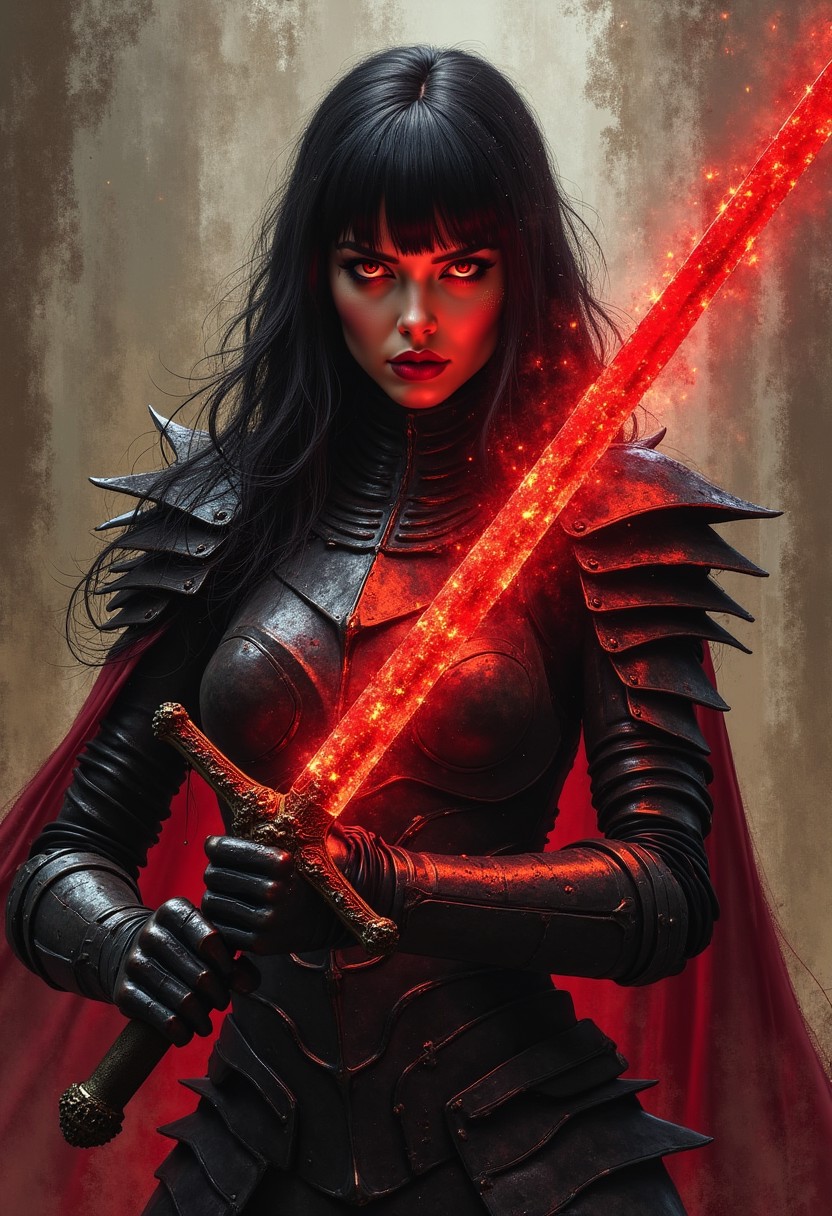renaissance masterpiece painting depicting a stunning female hellknight, spiky armour, no helmet, glowing eyes, dark hair, bangs, dark eyeshadow, thin red lips, holding huge sword glowing red, dynamic pose