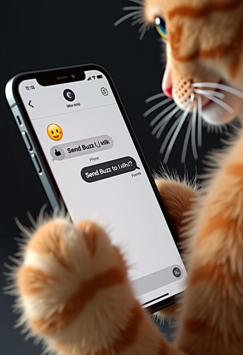 a cats paw holding iphone, looking at a render of an iphone, they recieve a text message the message reads "Send Buzz ;)" with a wink emoji. iphone is the main focus