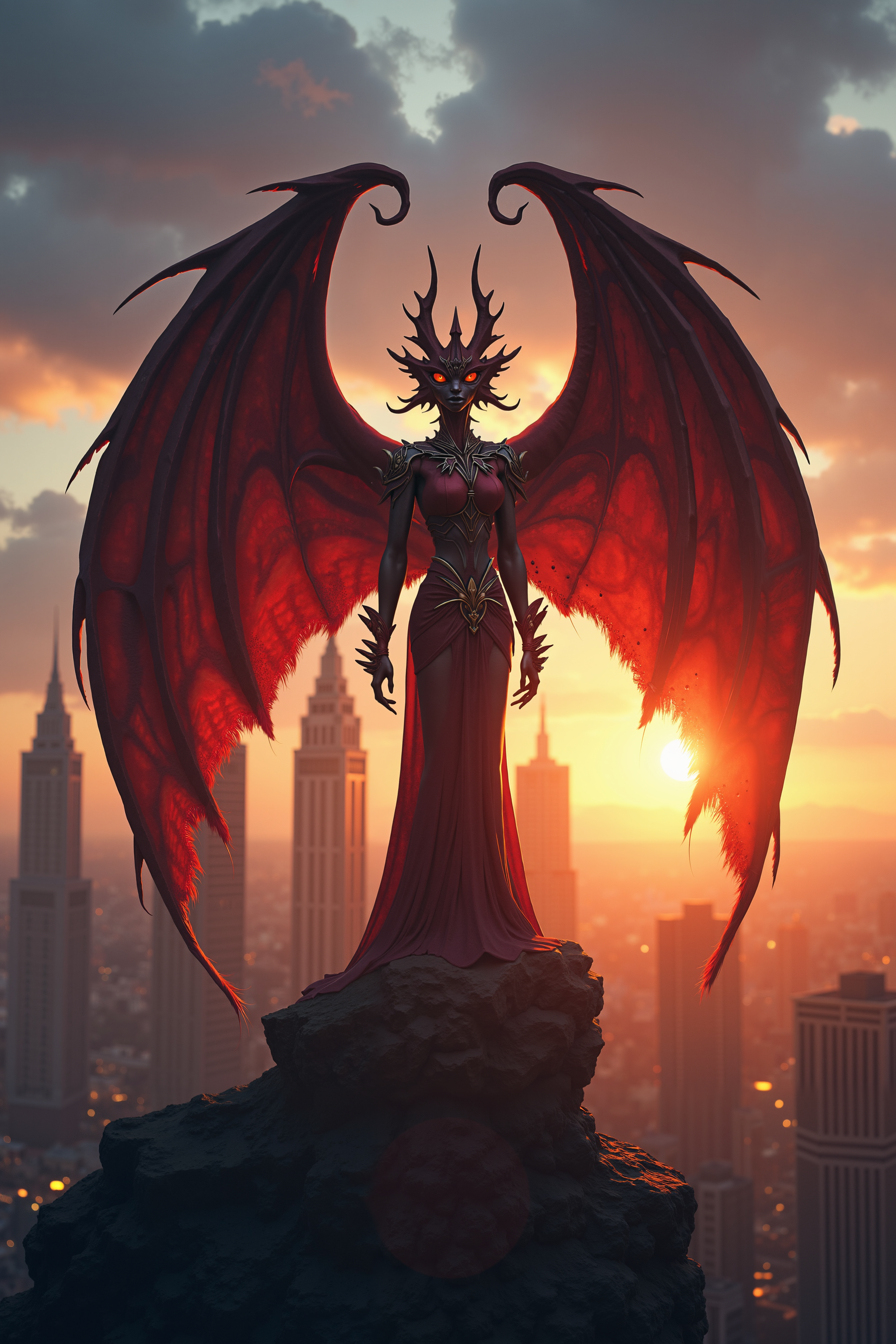 As the sun begins to dip below the horizon, a majestic Fandora, the Flying Furtress, stands tall against the backdrop of skyscrapers. The skyscrapers tower over them,
