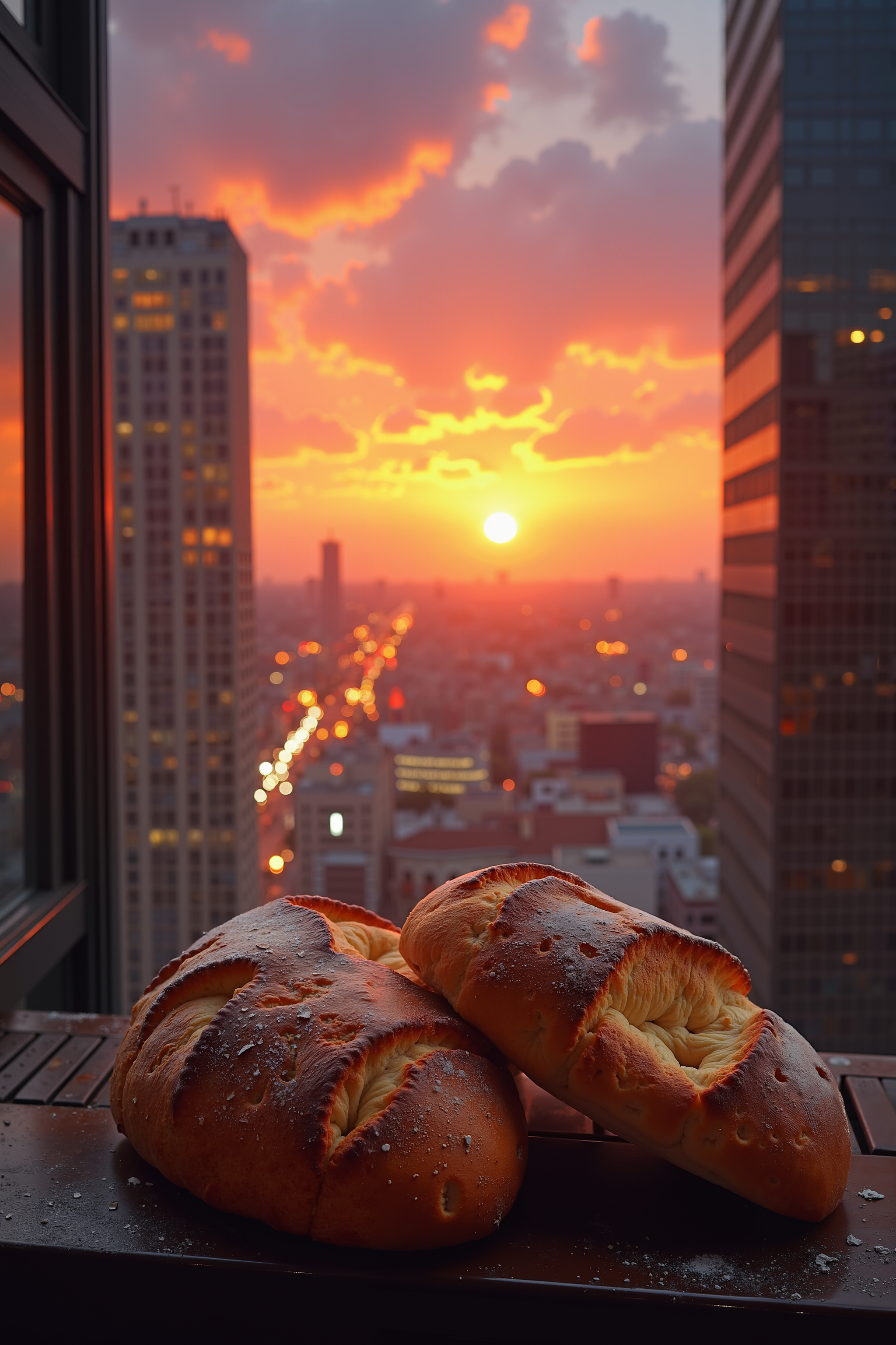 As the sun begins to set, a vibrant sky above the bustling city comes alive with orange and pink hues as the city's lights twinkle and dance. The air is filled with the sweet scent of freshly baked bread,