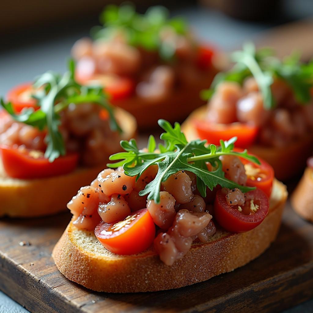 Delicious bruschettas with balsamic vinegar, tomatoes, arugula and tuna on table, closeup