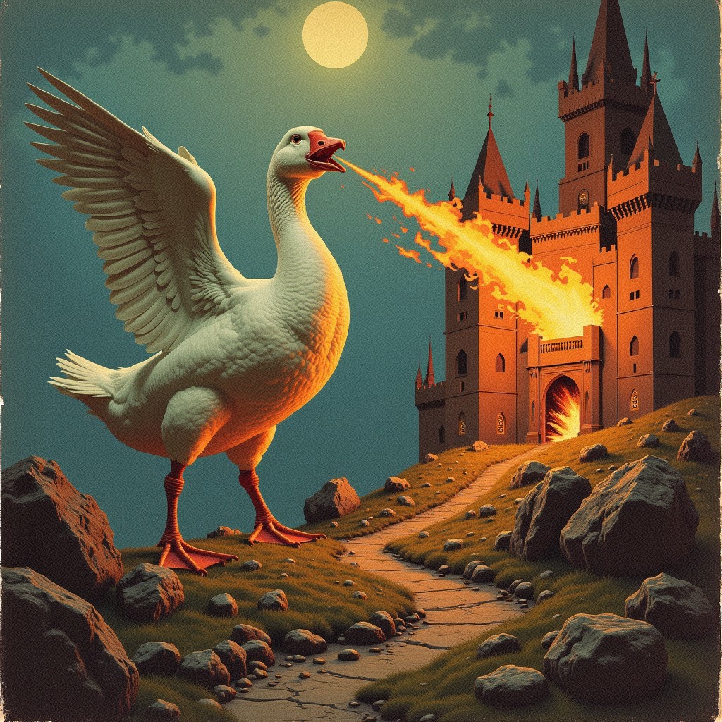DnD_Grainyboyz, noise, grainy, 1970’s dark fantasy artwork, a giant goose attacking a castle, exhaling fire on a castle, epic fantasy