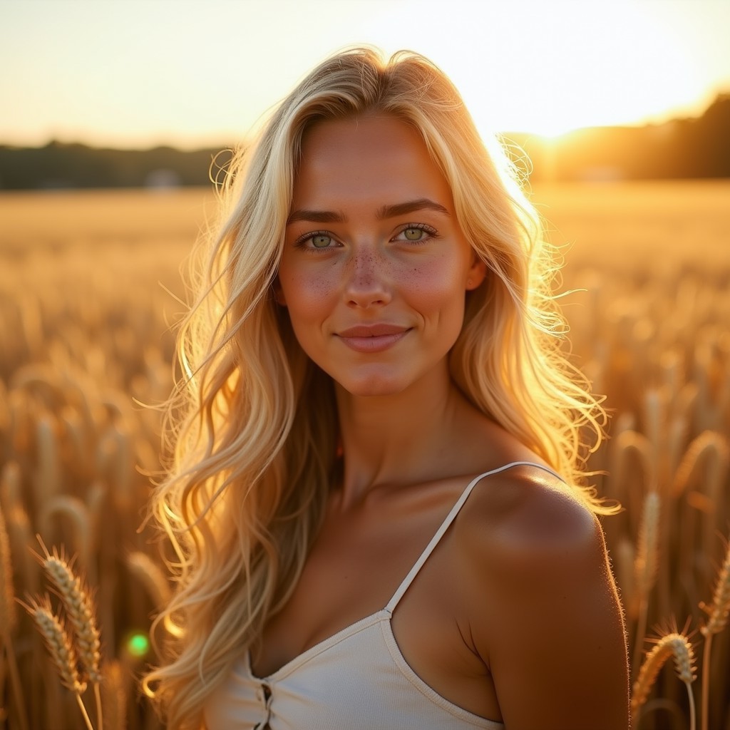 Full-body photography, 21-year-old female with long blonde wavy hair and blue eyes, faint freckles on face, hopeful look and slightly smiling. The background is a golden wheat field, golden sun rays shining, vast expanse of land under sunshine, overlooking view, warm colors.