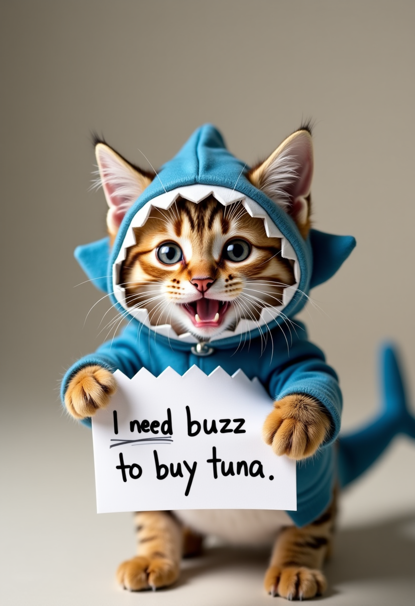 Cute little cat, shark outfit, playfull, happy, cuteness overload, holding a paper written "I need buzz to buy tuna", masterpiece, small centered composition, product shot, wallpaper art, Rule of Thirds, delicate,lovable, tiny, best, dynamic composition, magnificent, intense, perfect background.