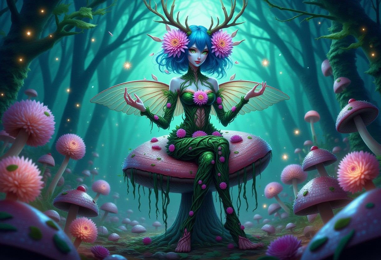 flowerdruid, 1woman with dahlia flowers, blue hair, beautiful green eyes, antlers, wings, sitting on a toadstool mushroom in an glowing enchanted forest, bioluminescence, twinkling lights, glowing