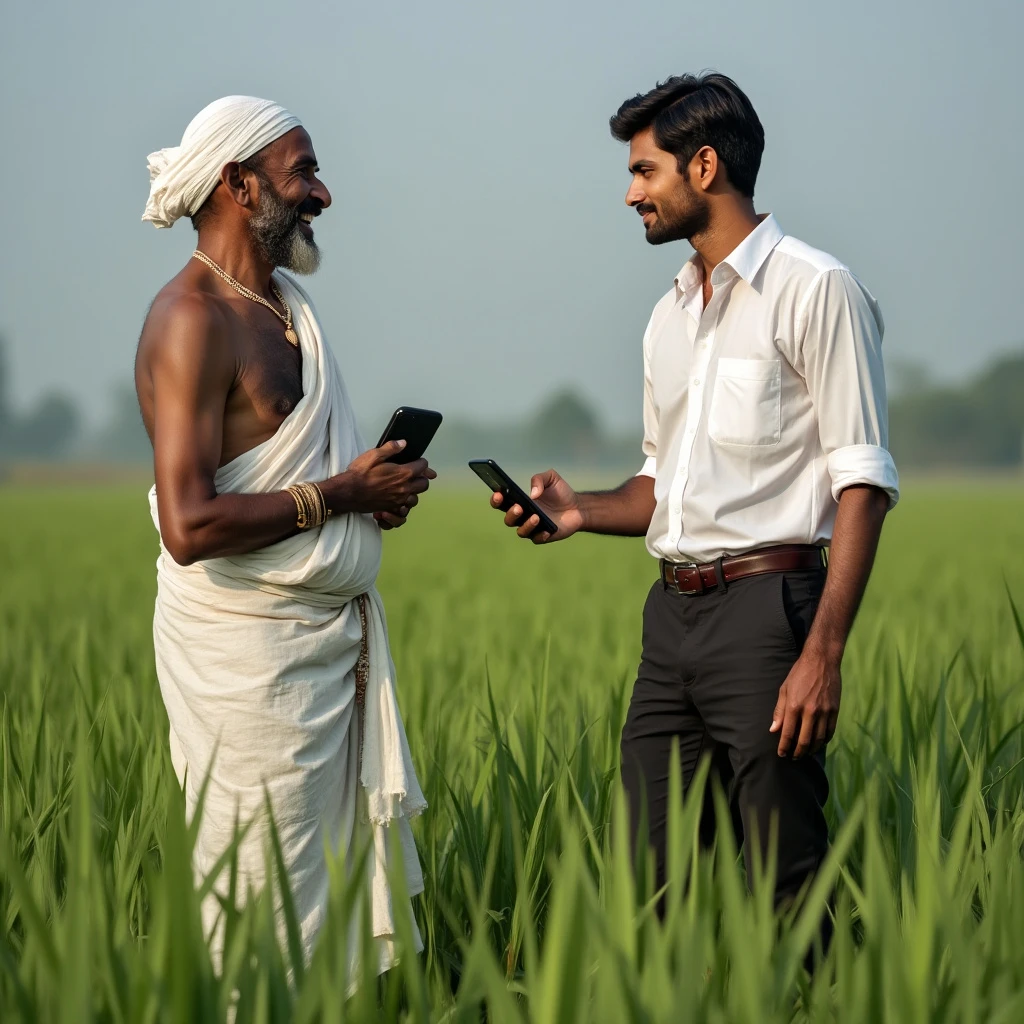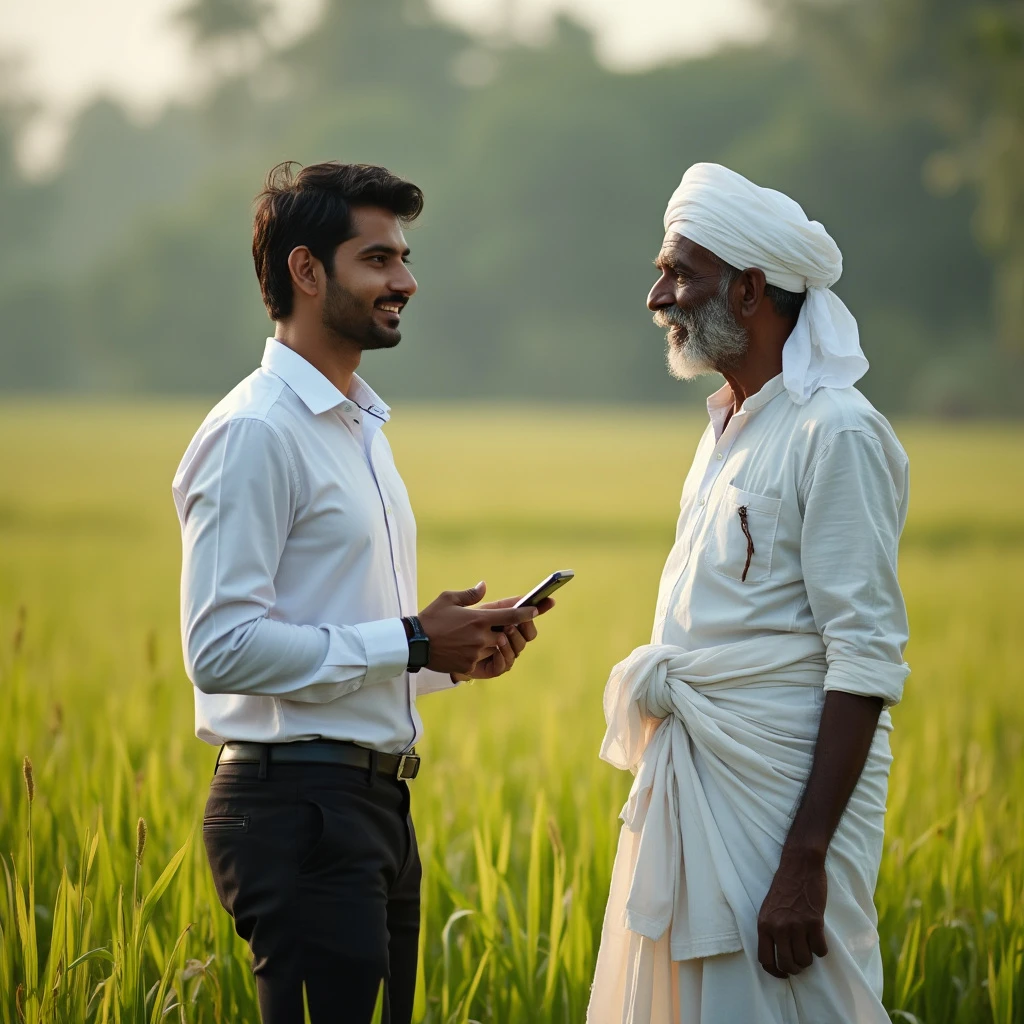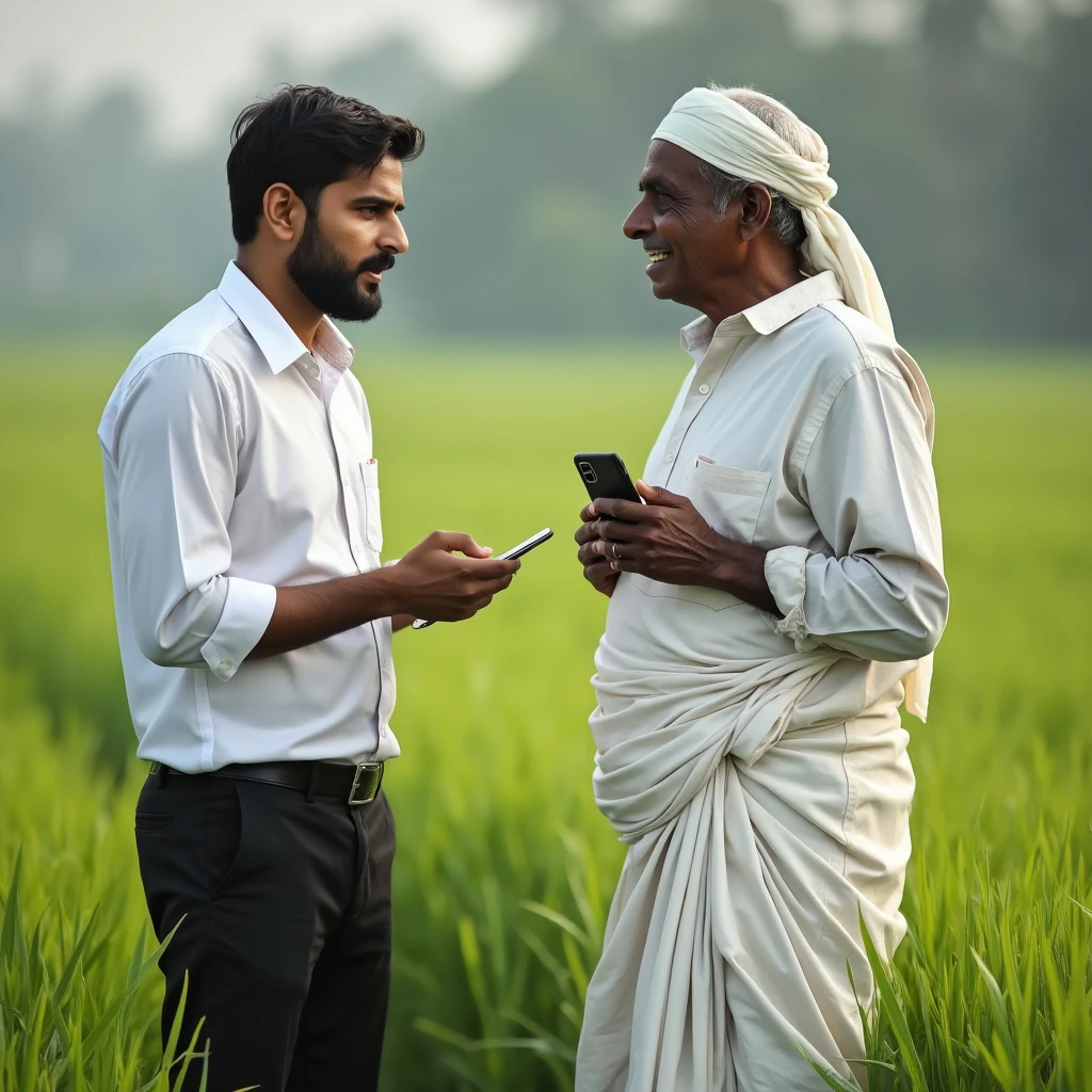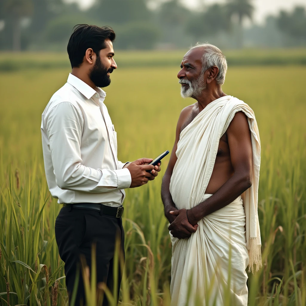 Square aspect ratio, a late 30s indain guy in white formal shirt and black pants with phone in his hand, talking to 40s indian farmer in white dhoti, standing in a paddy fields, ultra realistic image, natural lighting, natural skin tones