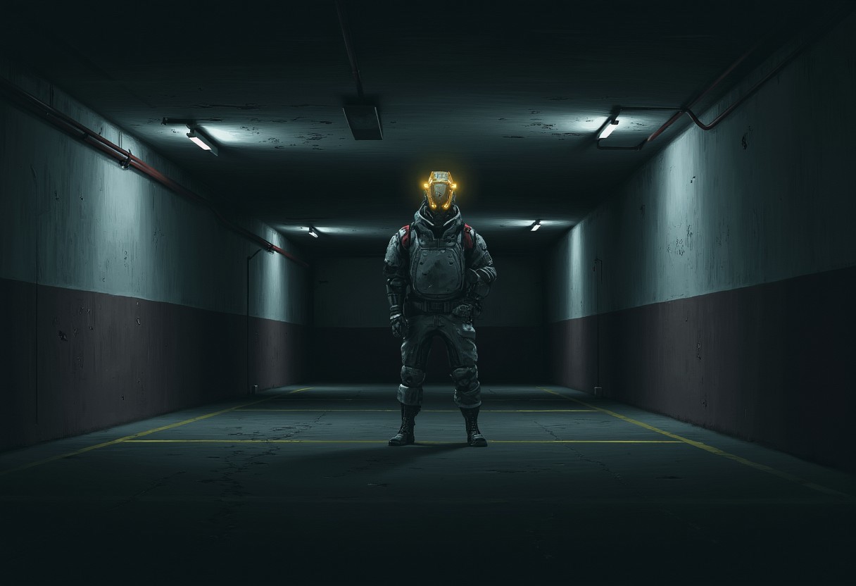 stalenhag, man, wearing cybernetic helmet, standing at the dark parking lot