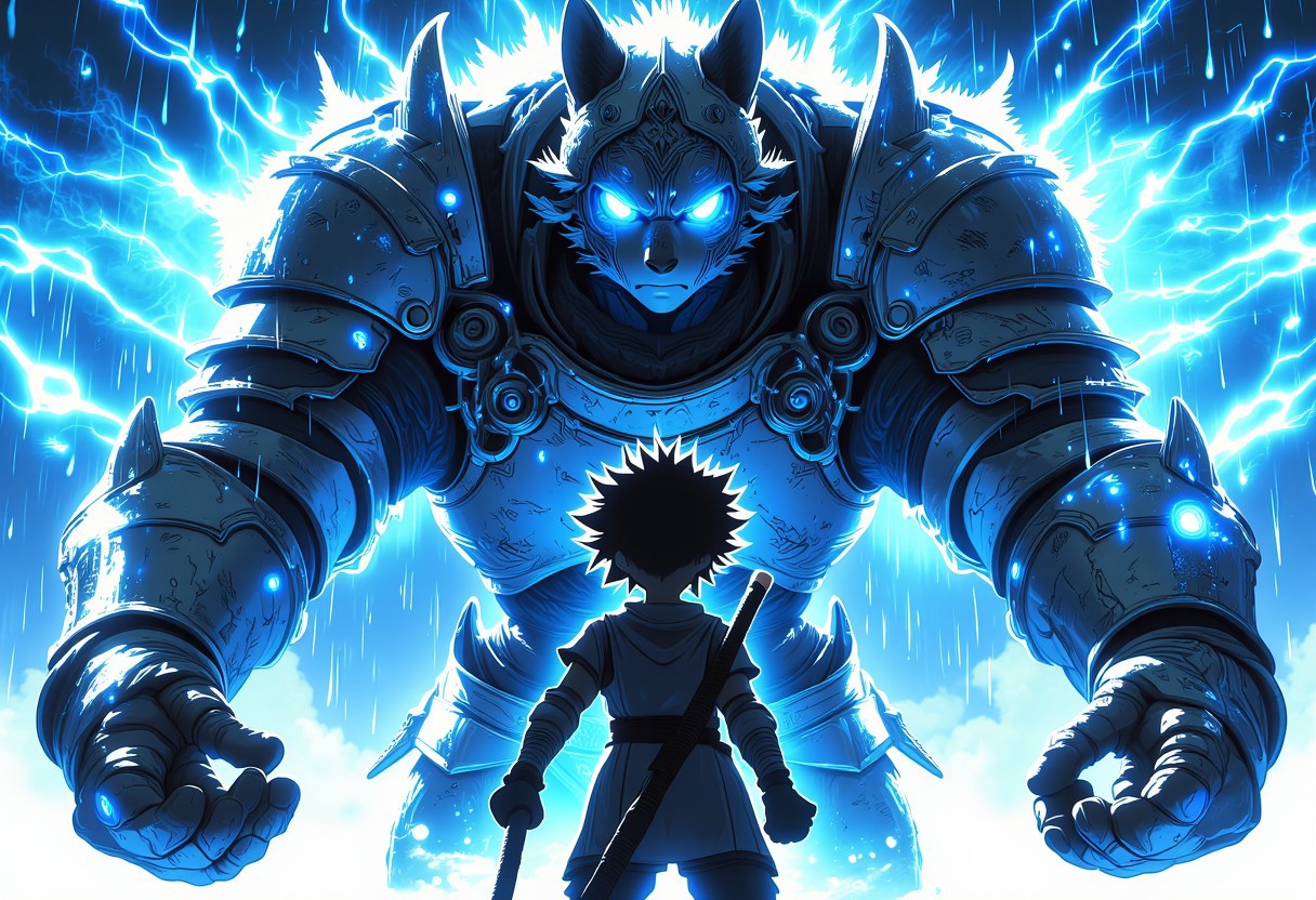 anime style, shaman king anime, boy with a fight stick stand in Martial arts pose. he has behind him a huge warrior spirit in Japonese armor with glowing runes, the spirit copied pose of boy, he is mystical half a wolf. agressive emotion and dynamic illustration winter, Blue, black and white colors