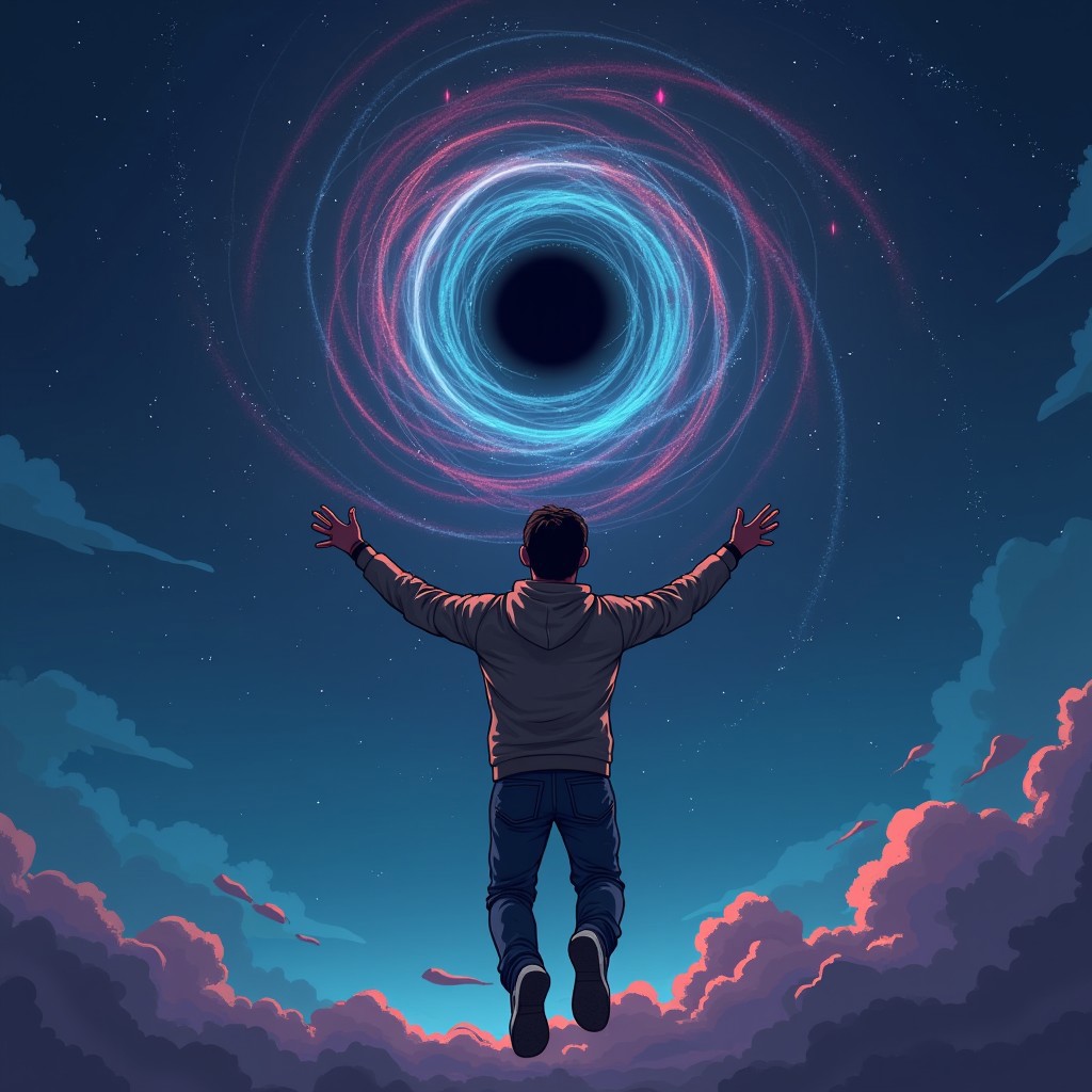 a man falling headfirst from the sky with his back to the viewer reaching out towards a small blackhole with neon swirls of light, night, a soft flat pastel art style with no line art, backlighting,
