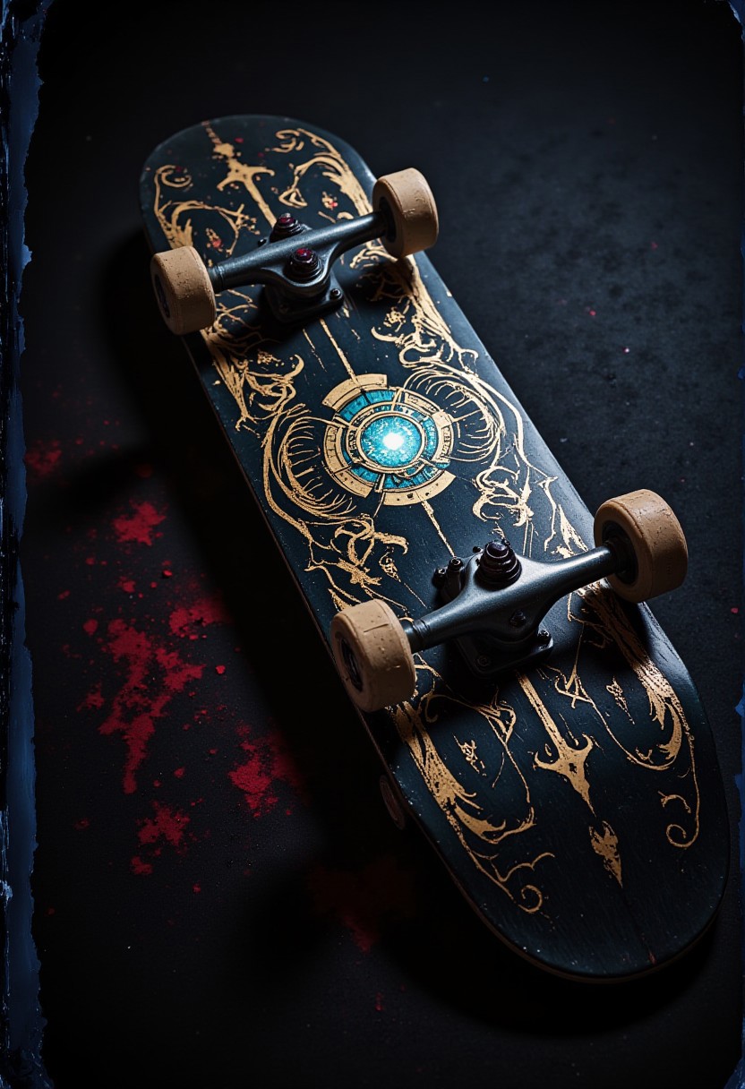 photograph, The Forces of Darkness, Insensitive (Container Skateboard:1.3) , intricate designs, Bathed in shadows, glowy Luminescence, still, Ilford XP2 400, pinhole lens, High Contrast, overly complex style, epic, realism, detailmaximizer, gaming, magic frame, object