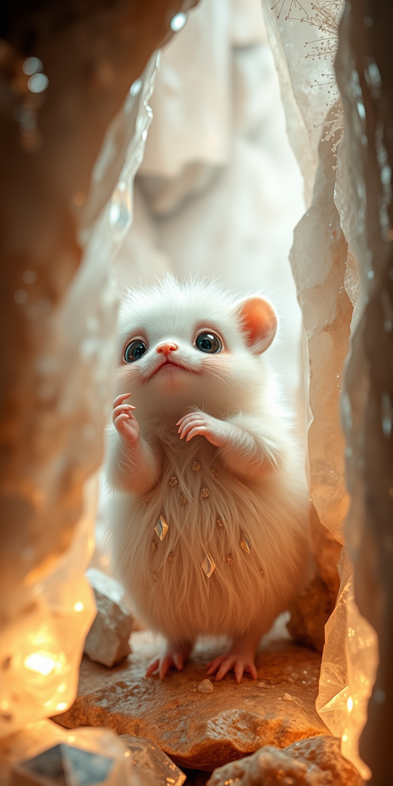 a picture of a of a small fat fluffy creature, whose fur is decorated with small polished crystals, which looks out curiously between two huge crystals, it holds on to the large crystals and leans forward slightly to take a close look at its surroundings, it is super cute and fluffy and looks at the viewer with big sparkling eyes, it's super cute how it looks up from the bottom, the scene takes place in a crystal cave, the walls are decorated with unpolished shiny crystals that reflect the light in the cave and everything on illuminate a harmonious and peaceful way,