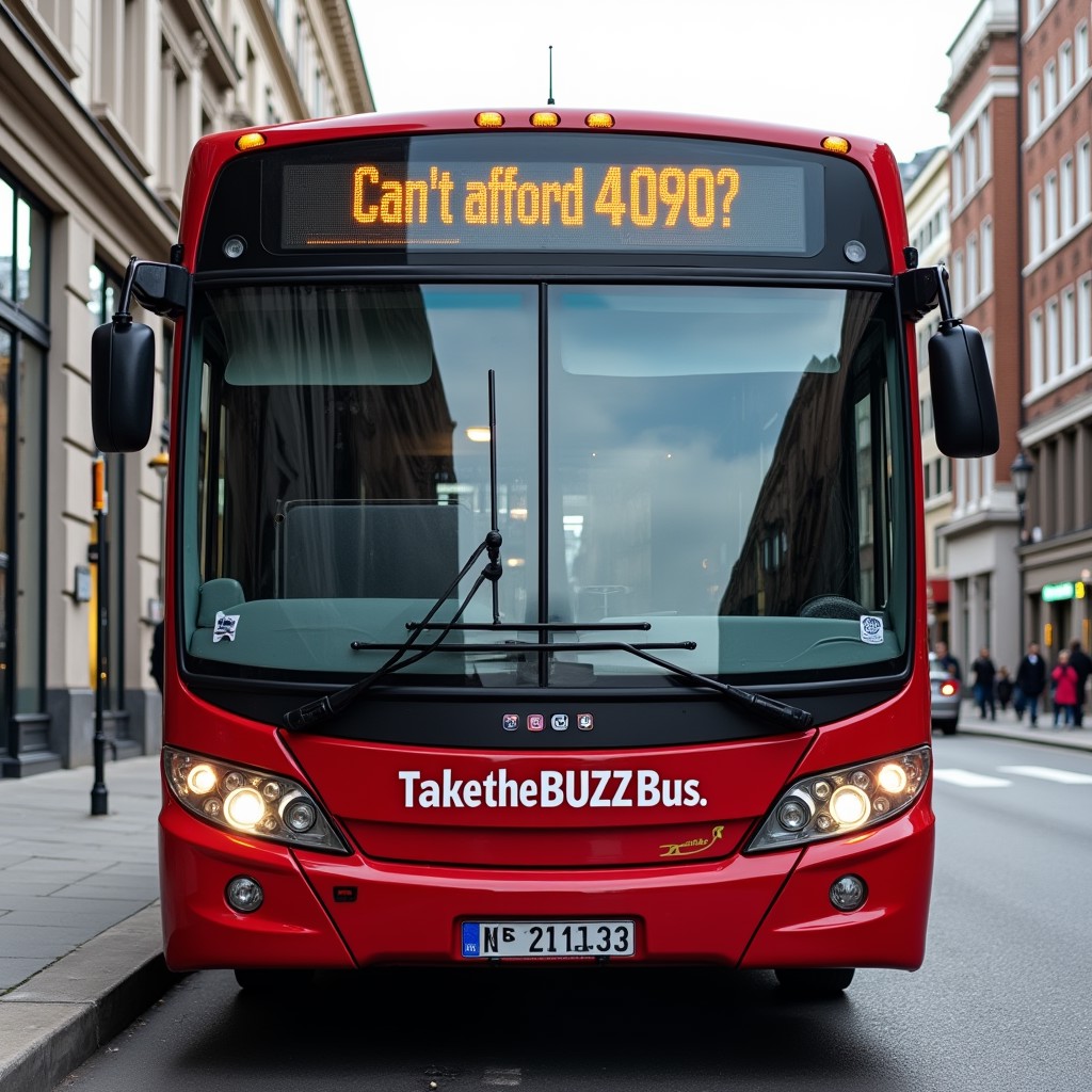 Front view of a city bus displaying "Can't afford 4090? Take the BUZZ Bus!"
