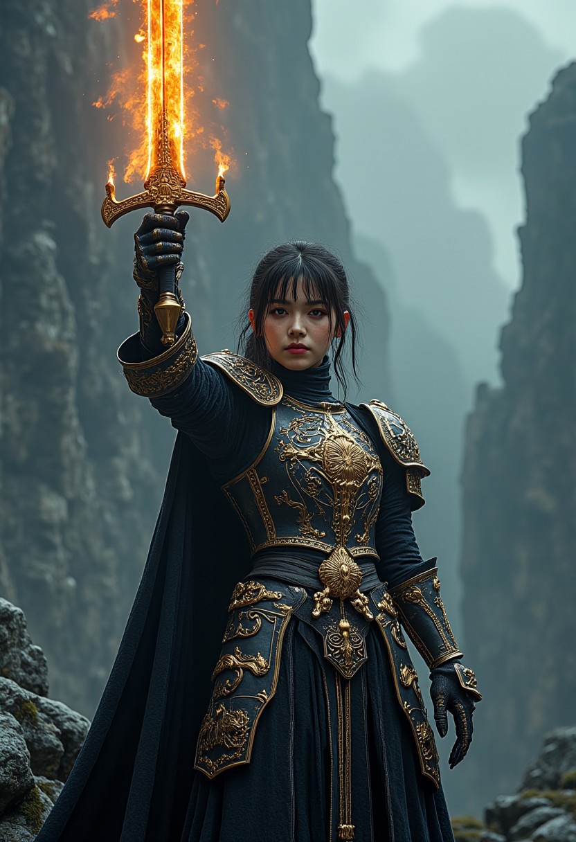 best quality, masterpiece, HDR photorealistic image, extremely detailed, great lighting, BREAK, Female oriental knight in full armor, hkstyle, gold with black and white embellishments, bangs, earrings, holding a legendary flaming sword aloft by the hilt, the blade above her head in a signal of triumph, on top of a mountain in stormy weather, dark clouds, shafts of light, High Definition HD, High Detail, Perfect Composition, dark fantasy movie, cowboy shot from the front