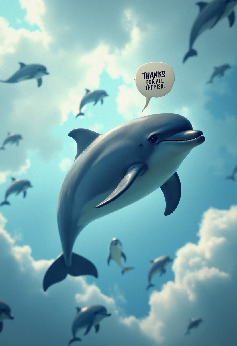 many dolphins flying through the cloudy sky, above the dolphin in focus is a speech bubble with the inscription "thanks for all the fish",