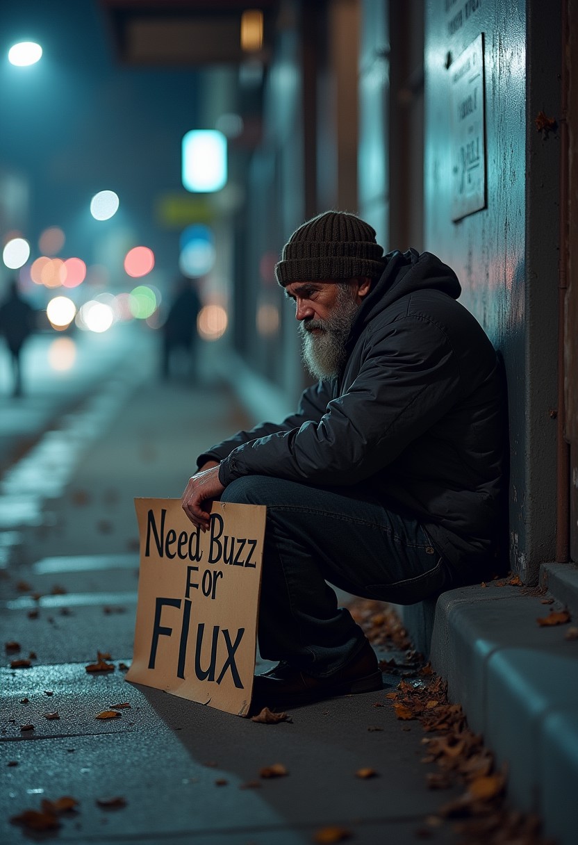 A homeless man in a ragged clothes sitting on the curb is seen in profile, his gaze slightly downward. He is holding a sign that reads "Need Buzz for Flux" in his hand. The dramatic lighting of the slushy metropolis creates a striking contrast. The shallow depth of field focuses on the sign, adding to the overall effect.