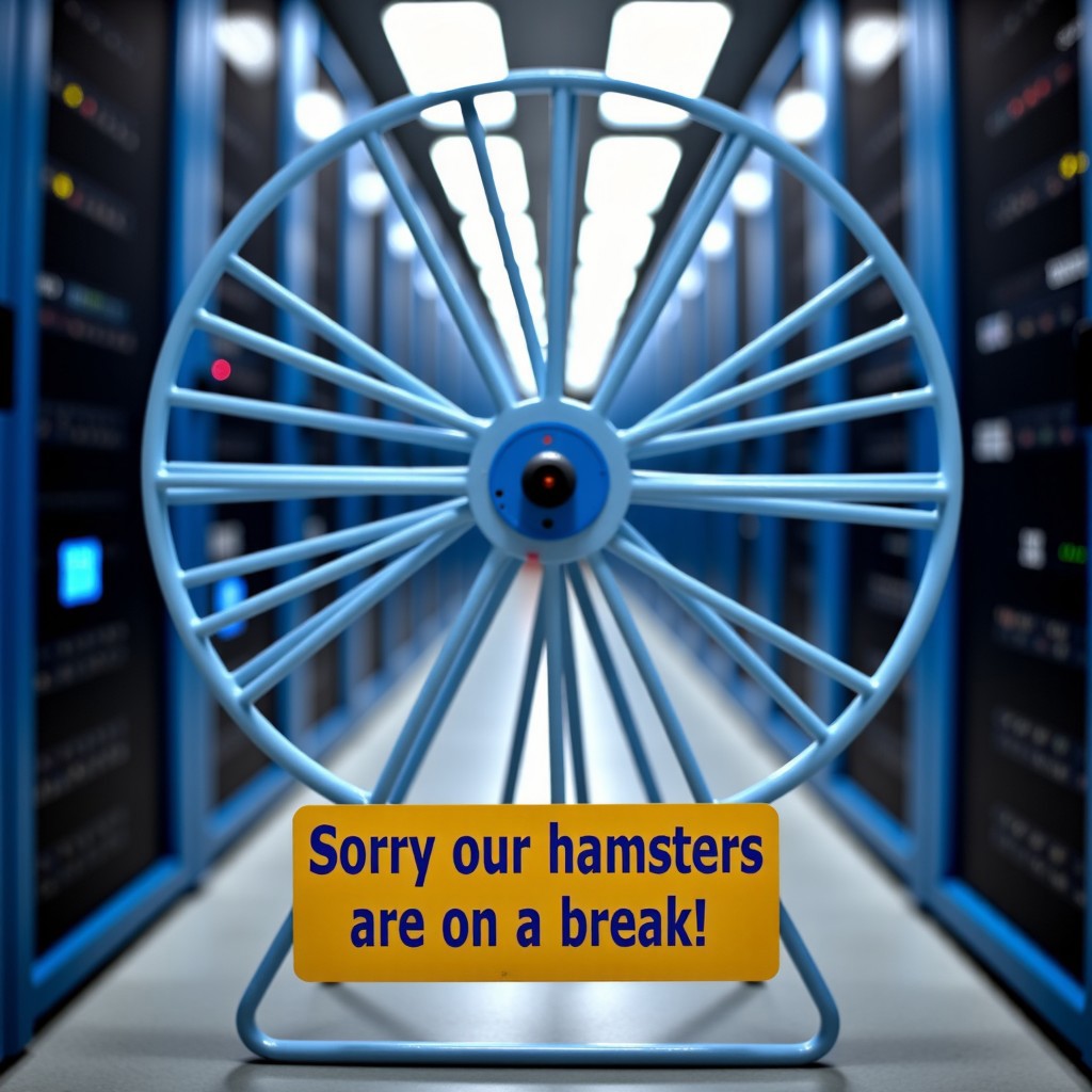 An empty hamster wheel is in the background of a computer server room, A sign in front of the hamster wheel which says "Sorry our hamsters are on a break!", detailmaximizer