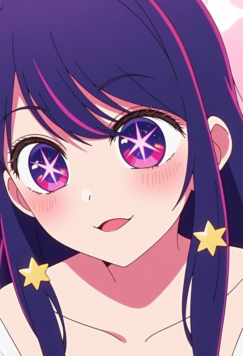 Hoshino Ai, a girl with long purple hair and striking purple eyes that feature star-shaped, symbol-like pupils. She's the sole focus of the image, looking directly at the viewer with a playful smile. Her mouth is open, and a subtle blush adds to her charming demeanor. She wears star-shaped earrings that match the symbols in her eyes, adding a touch of sparkle to the scene