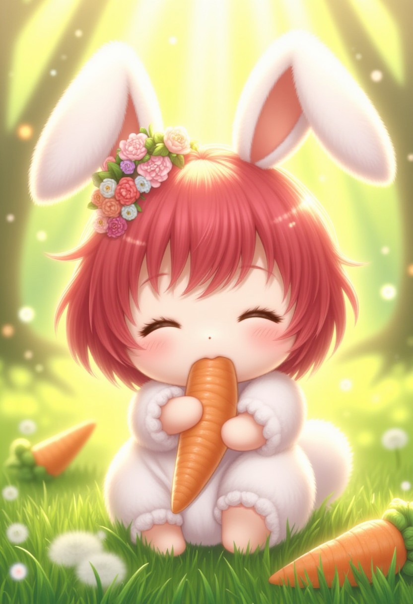 Cute bunny, makima, red hair, munching on a carrot, blurred meadow background with soft bokeh lights, serene mood super cute wallpaper, anime, comic, bokeh , chibi animal, detailmaximizer,