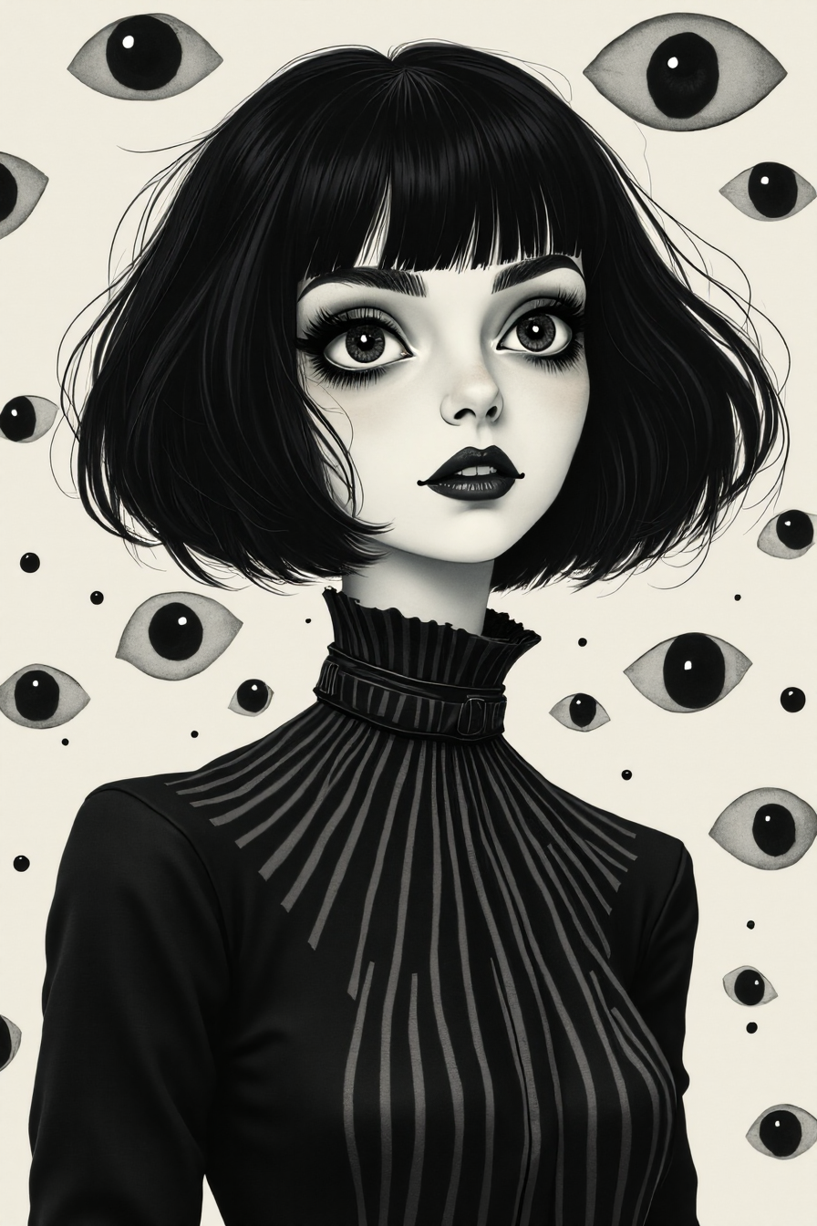 gothic woman with short hair in black and white with long striped collar blouse and many abstract eyes looking at her