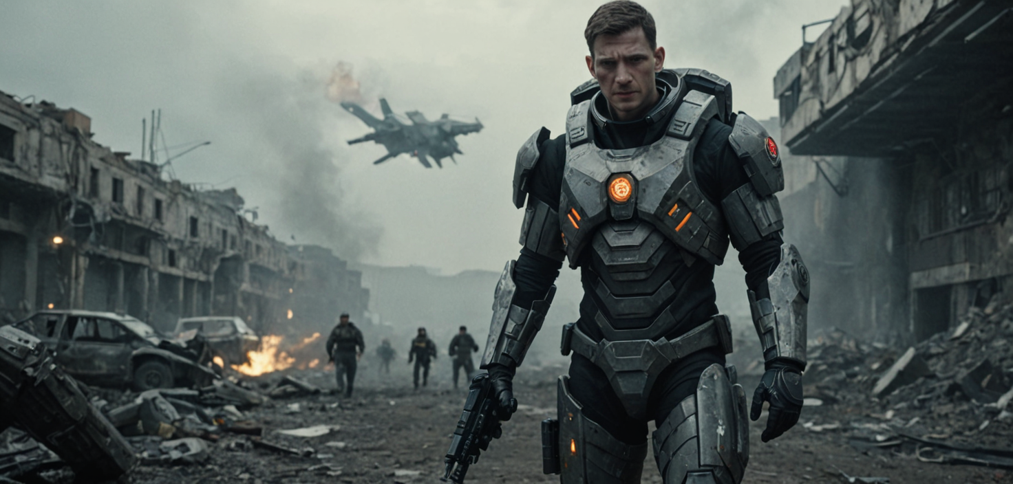 cinematic scene, realistic image, science fiction, the soldier who must choose between following orders and saving the lives of innocent civilians during a war between two AI factions, highly detailed