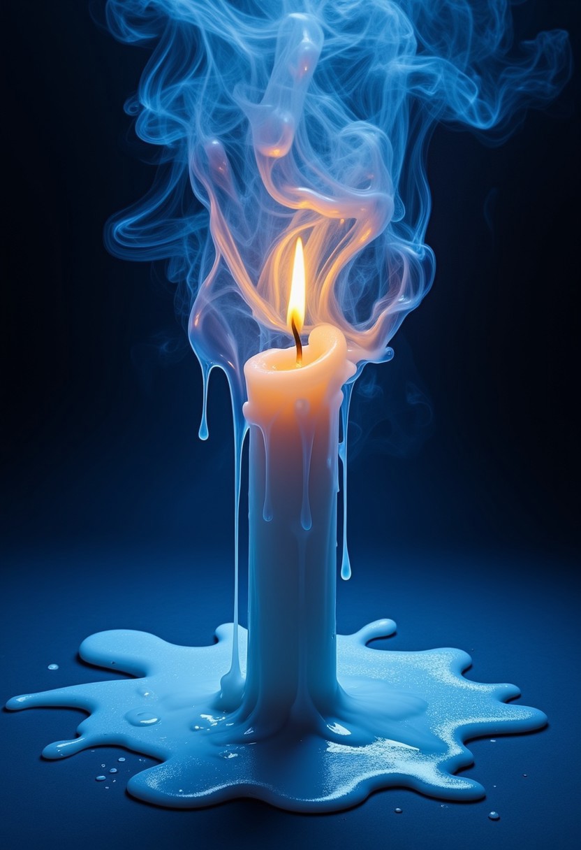 A melted candle, its wax distorted by the swirling presence of a woman with dark hair, depicted in neon impressionism. The dripping wax forms spiral vortex patterns in dark indigo and pale smoke, with the candle appearing to be crafted from delicate feathers. The expressive interplay of light and shadow enhances the scene's emotive warmth and melancholy in an expressionist style.