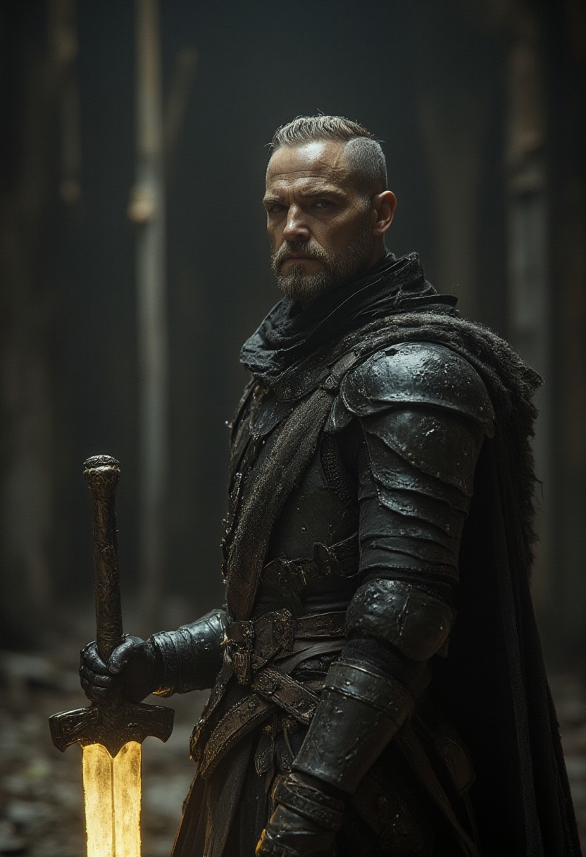 DARK movie still, heavy Film grain, monochrome with Low Key color Highlights, A dystopian DARK villain Photo Portrait of hkstyle dystopian Knight wielding a white moon shaped glowing scythe, outworn Cape and armored suit, rough skin, skin Details, beard, outworn, old, in pain, dust, dirt, gritty, Film Noir Style, high contrast, deep blacks, vibrant Yellow Pop art elements, soothing bleaked atmospheric lighting