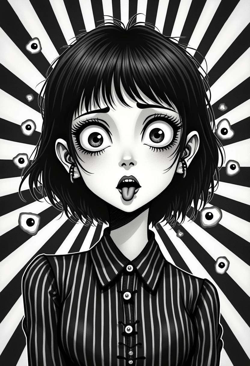 gothic woman with short hair and tongue sticking out in black and white with long striped collar blouse and many abstract eyes looking at her on background with many stripes