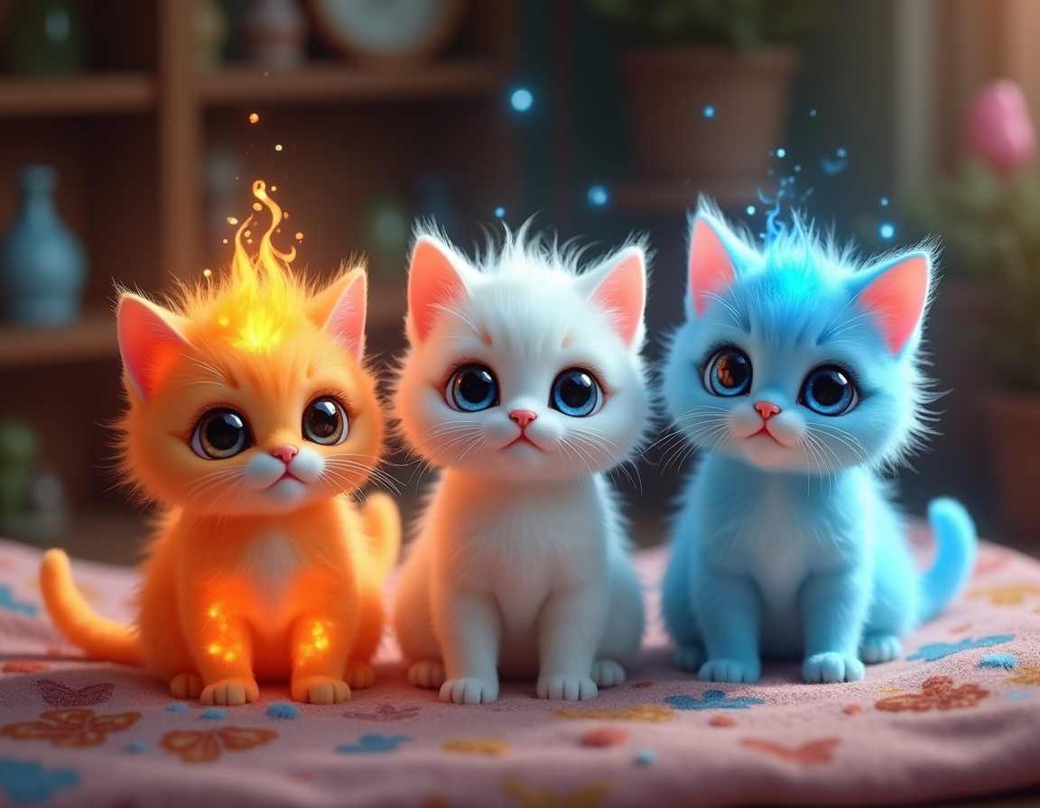 a realistic cgi of three cute cats. Each one of them represents one of the natrual element of fire, water and air. They are translucent. They are mystic creatures. They are on a comfort magic blanket. They are in a wizards pet store and waiting to be adopted. They stare towards viewers with watery shiny big eyes.