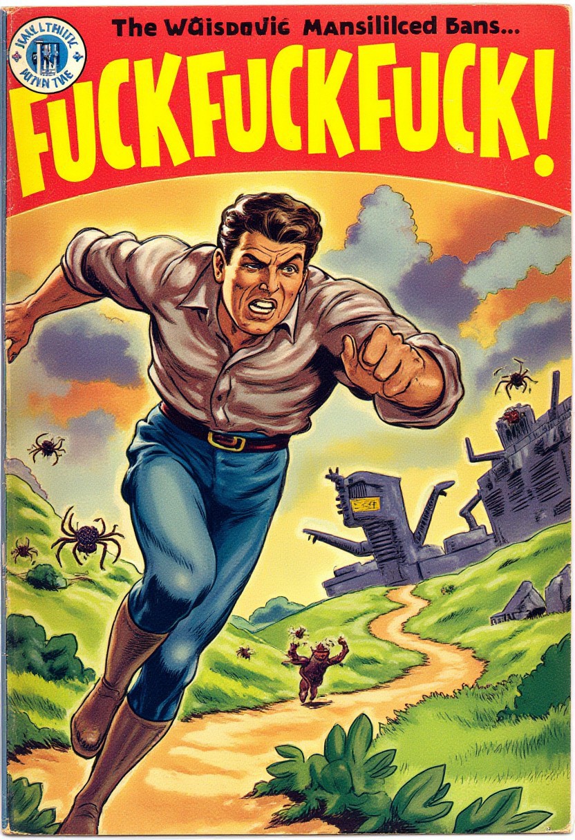 A magazine featuring a frightened man running from spiders, the title reads: FUCKFUCKFUCK!, vintage comic book cover, 1950s pulp art style
