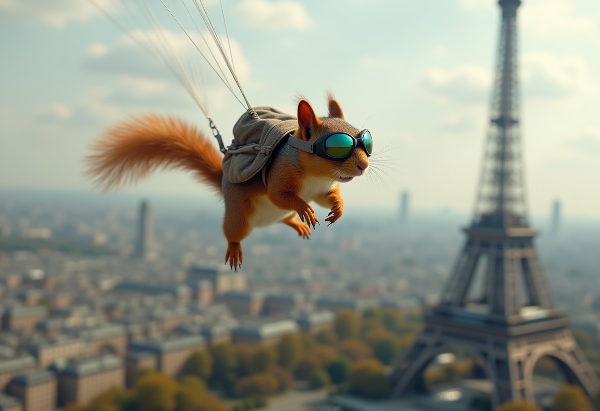 A flying squirrel, mid-air, soaring and gliding through the air, the squirrel is wearing goggles and a parachute on its back, action shot as it soars off the top of the Eifel Tower