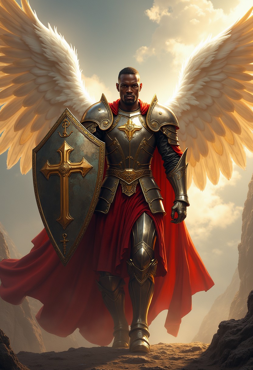 Amazing fantasy art, an African paladin warrior, plate armor, shining holy steel with gilding, massive shield depicting holy cross, the paladin has wispy wings of white light, wings made of pure wavering energy, Tyraerl has fallen to Earth as the angel of justice, epic lighting, perfect background, in New Tristram,