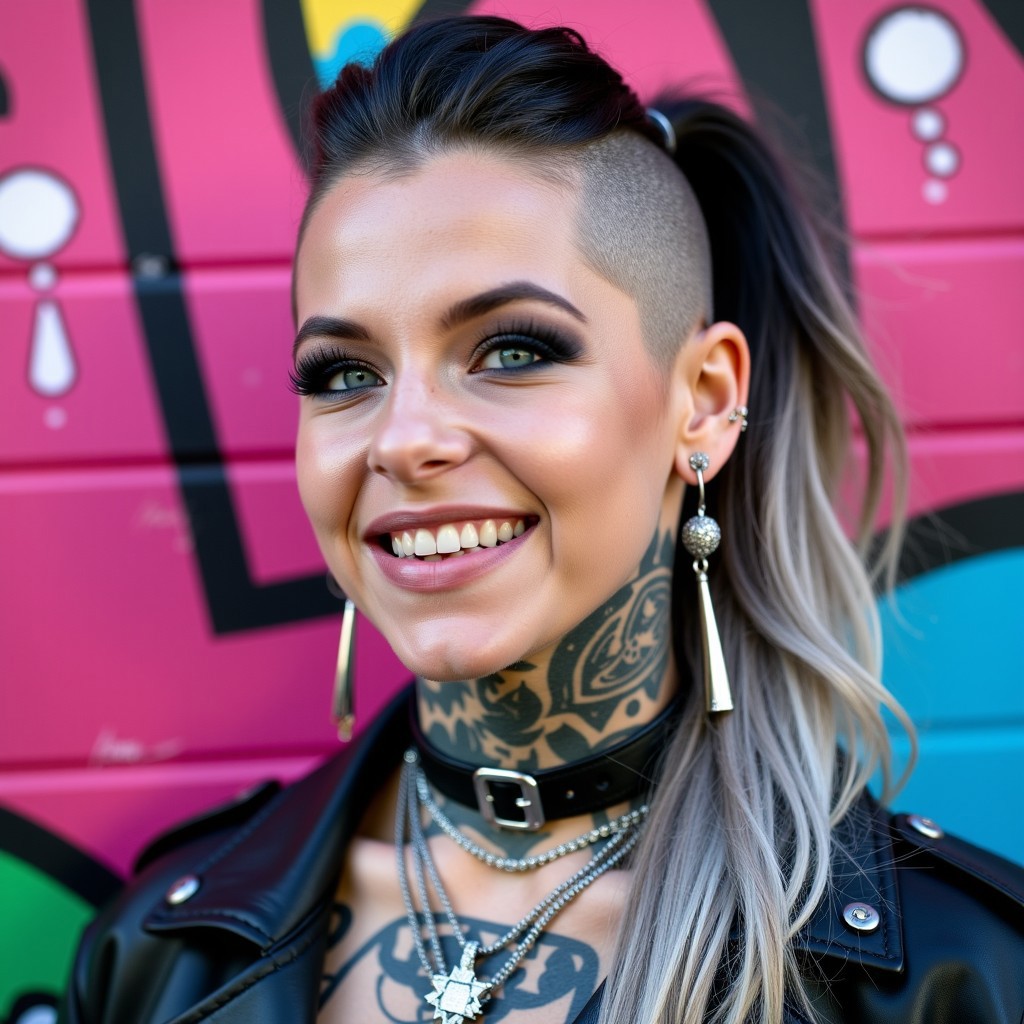 A vibrant and edgy portrait of a young woman with a rebellious, punk-inspired style. She has a striking appearance with half of her head shaved, revealing intricate tattoos that extend from her neck to her jawline, while the other half of her hair is long and dyed in a gradient from black to silver. Her sharp, cat-like eyes are highlighted by dramatic, dark eye makeup and a bold, winged eyeliner. She sports a wide, confident smile that reveals perfectly aligned teeth. Her ears are heavily pierced, featuring multiple rings and studs, along with a long, dangling earring on one side. Around her neck, she wears a black leather choker with a silver buckle and multiple layered chains with unique pendants, adding to her tough, yet stylish look. The background is a vibrant, graffiti-covered wall that complements her alternative, urban aesthetic.