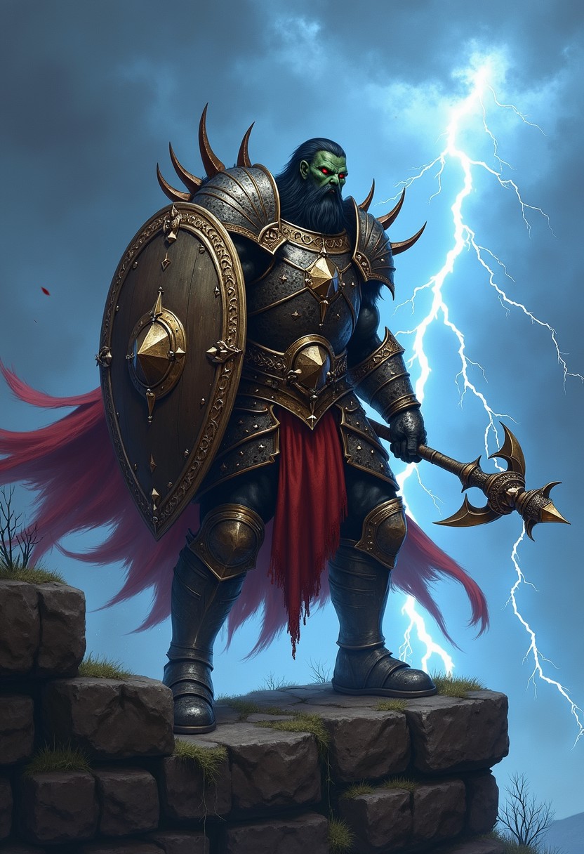 Amazing fantasy art, a half-orc fighter wearing holy paladin armor, giant spiked shield, helm with crystals embedded, carrying a morning star weapon, powerful warrior, the half-orc is strong and ferocious, standing atop a stone wall in Cornwall, epic lighting, lightning storm brewing in the distance, well-equipped fighter of 20th level mastery
