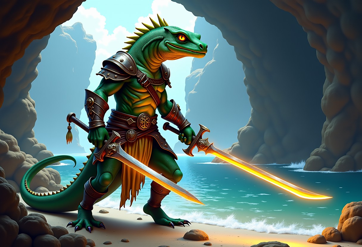 Fantasy art, a lizardman hero, well-equipped for the campaign, enchanted armor, glowing scimitar, wicked sharp blade, the lizard man is a pirate fighter, he has light armor, strong warrior lizard-man, in a coastal cave, perfect background, epic lighting, amazing details, RPG universe, awesome character,