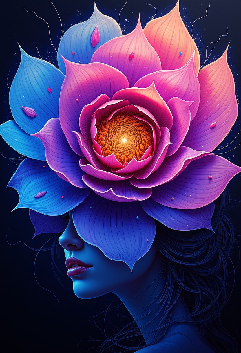 A blossoming flower, its petals intricately designed with fractal patterns, intertwining with the swirling figure of a dark-haired woman, portrayed in neon impressionism. The petals spiral into vortex patterns of vibrant magenta and shadowy indigo, with the entire flower appearing as if made of delicate, feather-like textures. The expressive light and shadow create a mesmerizing, almost otherworldly aura, capturing the beauty of nature in a highly emotive, expressionist style.