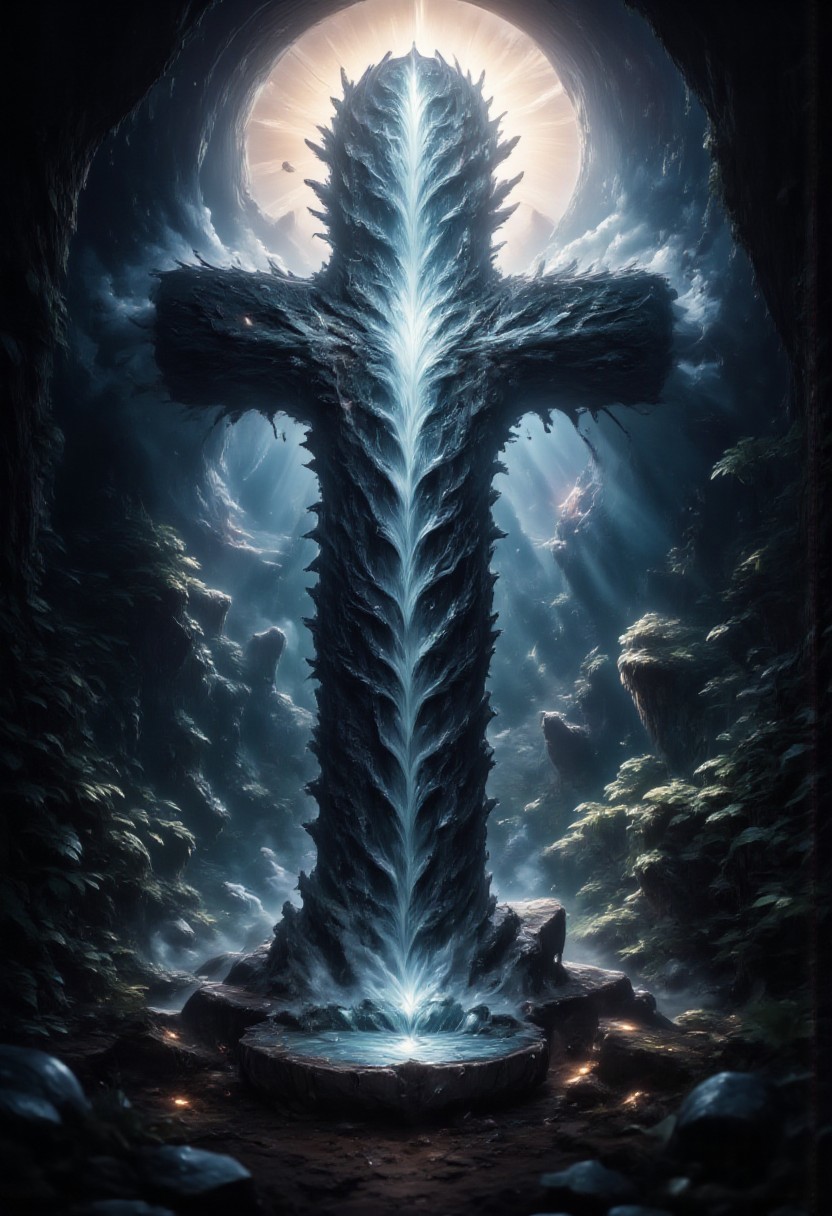 a buried broken zwart cross glazed by the sun emitting smoke, backlit, forgotten, atmospheric AF, detailed, 8k , , detailmaximizer, midjourneyv6.1,