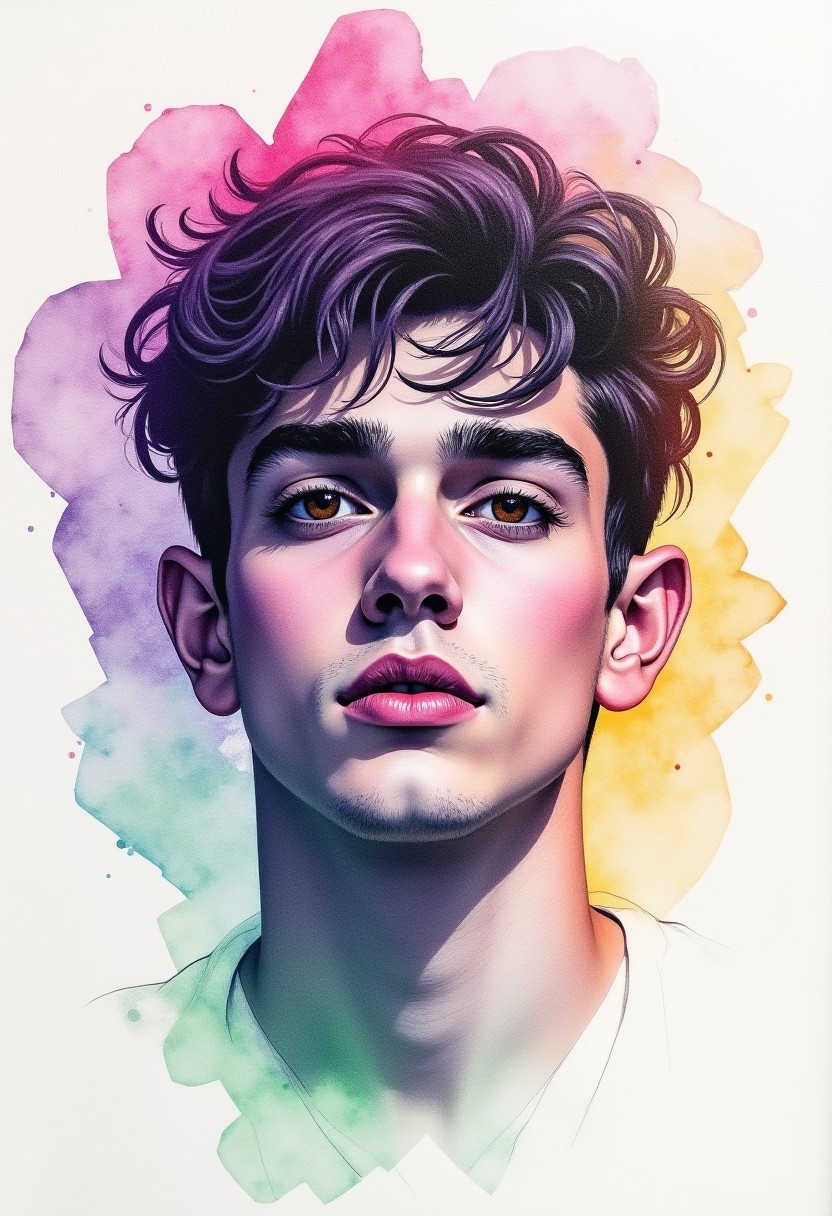 surreal portrait of a handsome young man made in watercolor, large bright blurred watercolor ((geometric)) shapes (Purple, Pink, Green) in the foreground portrait of a young man in black marker, his sad face, long thick eyelashes, thin lips with corners down, masterpiece, modern art, abstraction. ART_painting,colored pencil,sketch,watercolor paper, (((paper texture))), watercolor