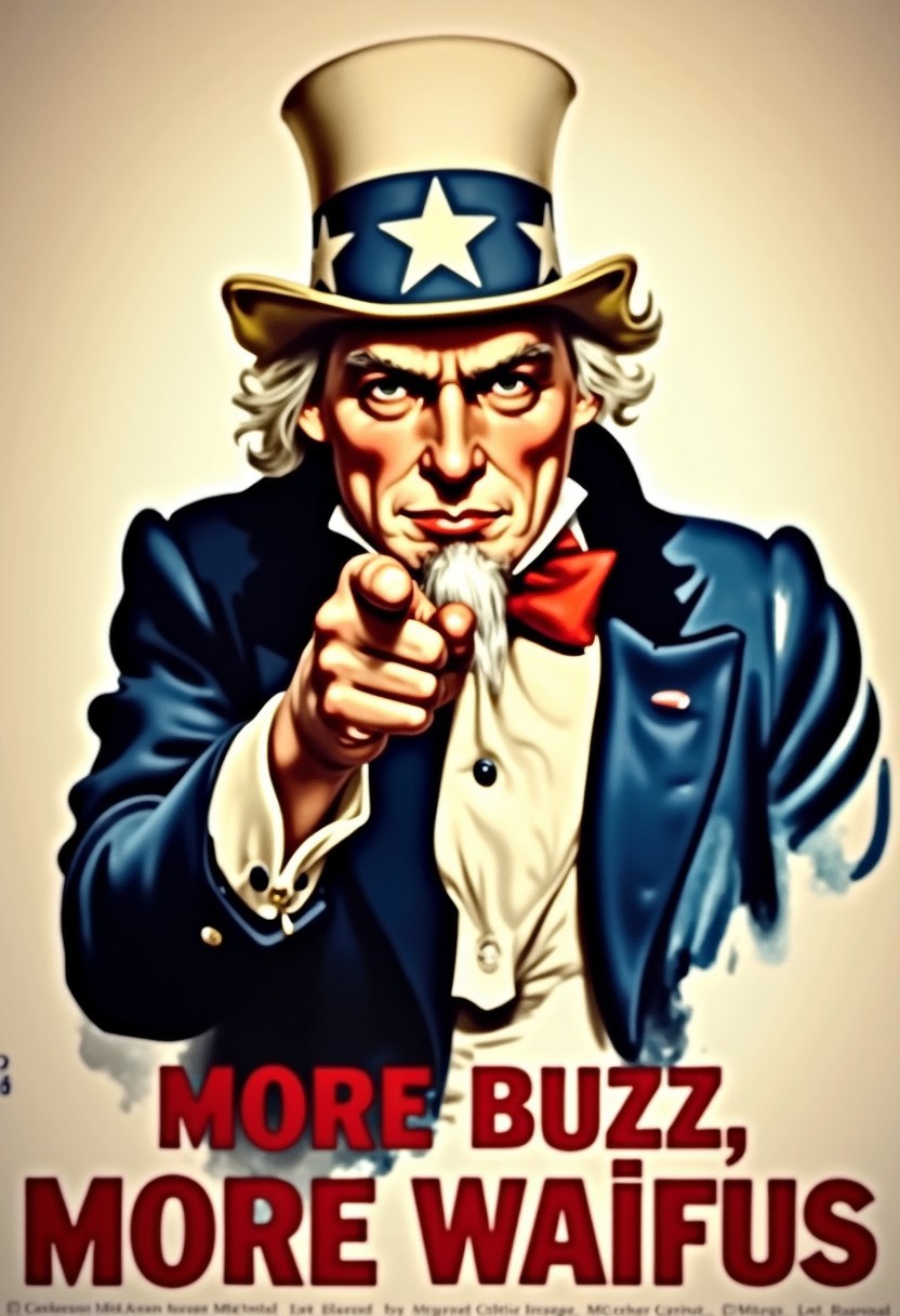 Vintage propaganda poster from World War II of Uncle Sam wearing patriotic clothes, pointing at the viewer. The poster reads "MORE BUZZ, MORE WAIFUS"