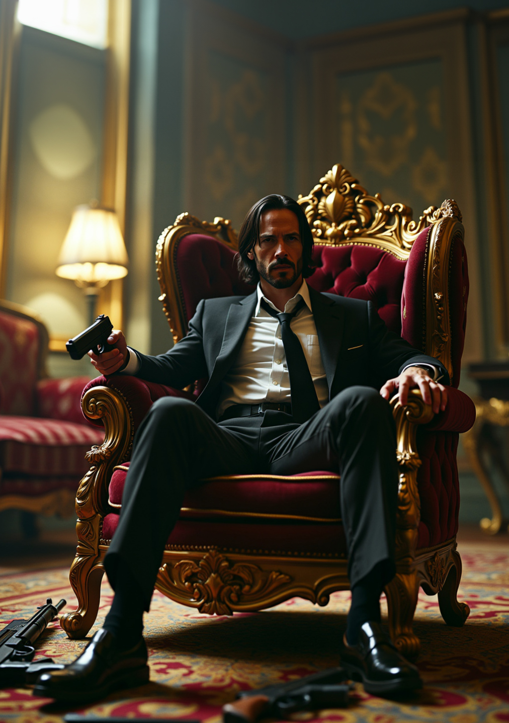 A hyper-realistic scene of John wick sitting on an opulent, luxurious chair made of gold, many guns on the floor. John wick is dressed in black suit and white shirt, black necktie, holding a Gun. (realistic:1.3), finely detailed, quality, (masterpiece:1.2), (photorealistic:1.2), (best quality), (detailed skin:1.3), (intricate details), dramatic, ray tracing, photograph, Visual novel, Suffering, film grain, Polaroid, 35mm,