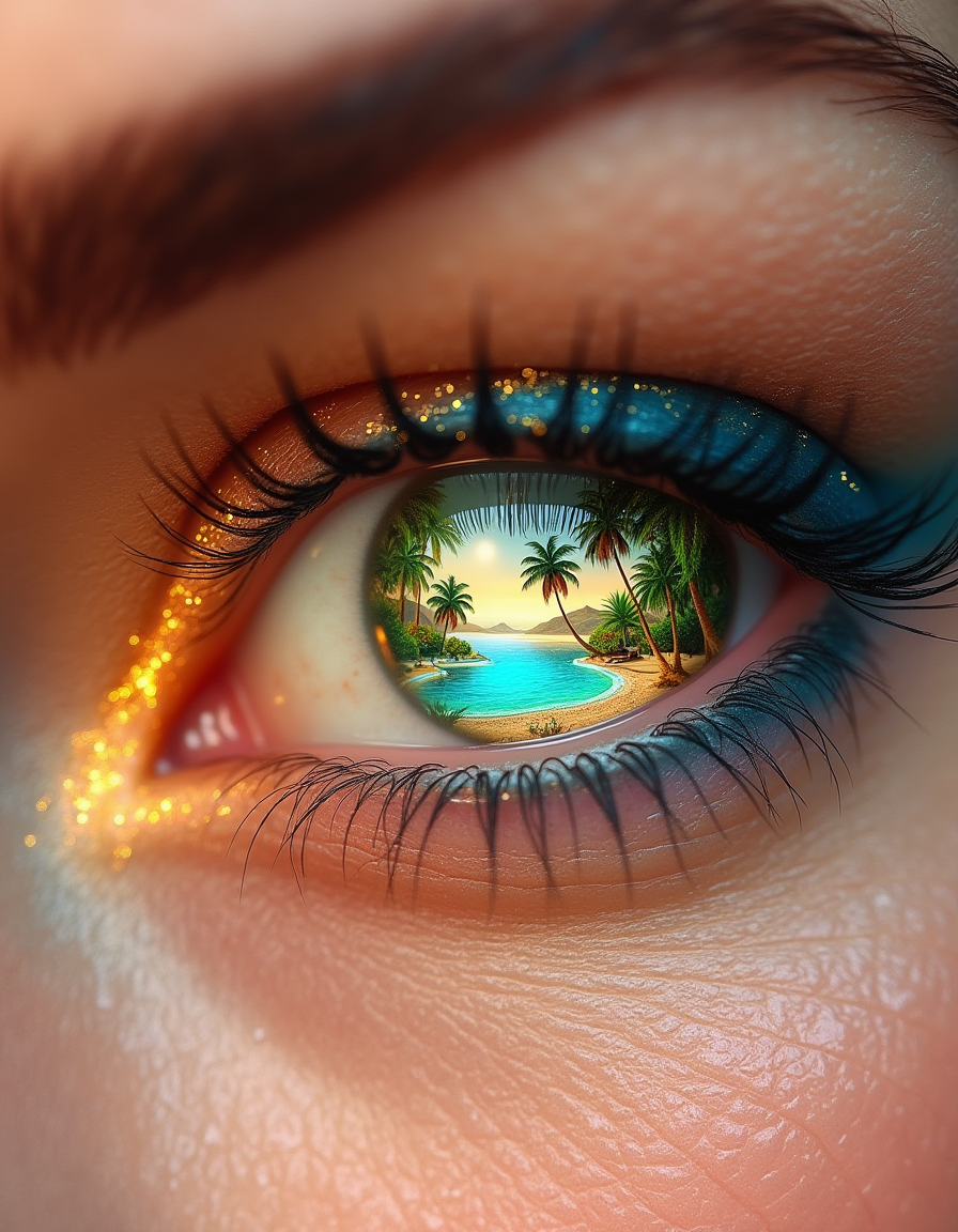 A striking close-up of an eye capturing a vibrant, magical desert oasis. The iris displays a shimmering oasis with lush, verdant palms, sparkling blue waters, and golden sands, bathed in a warm, radiant light. The makeup is light and blended, with bright, desert-inspired colors and delicate, glowing accents that reflect the oasis’s enchanting beauty. The eye scene includes vibrant palm trees, sparkling water, and a golden, magical glow.