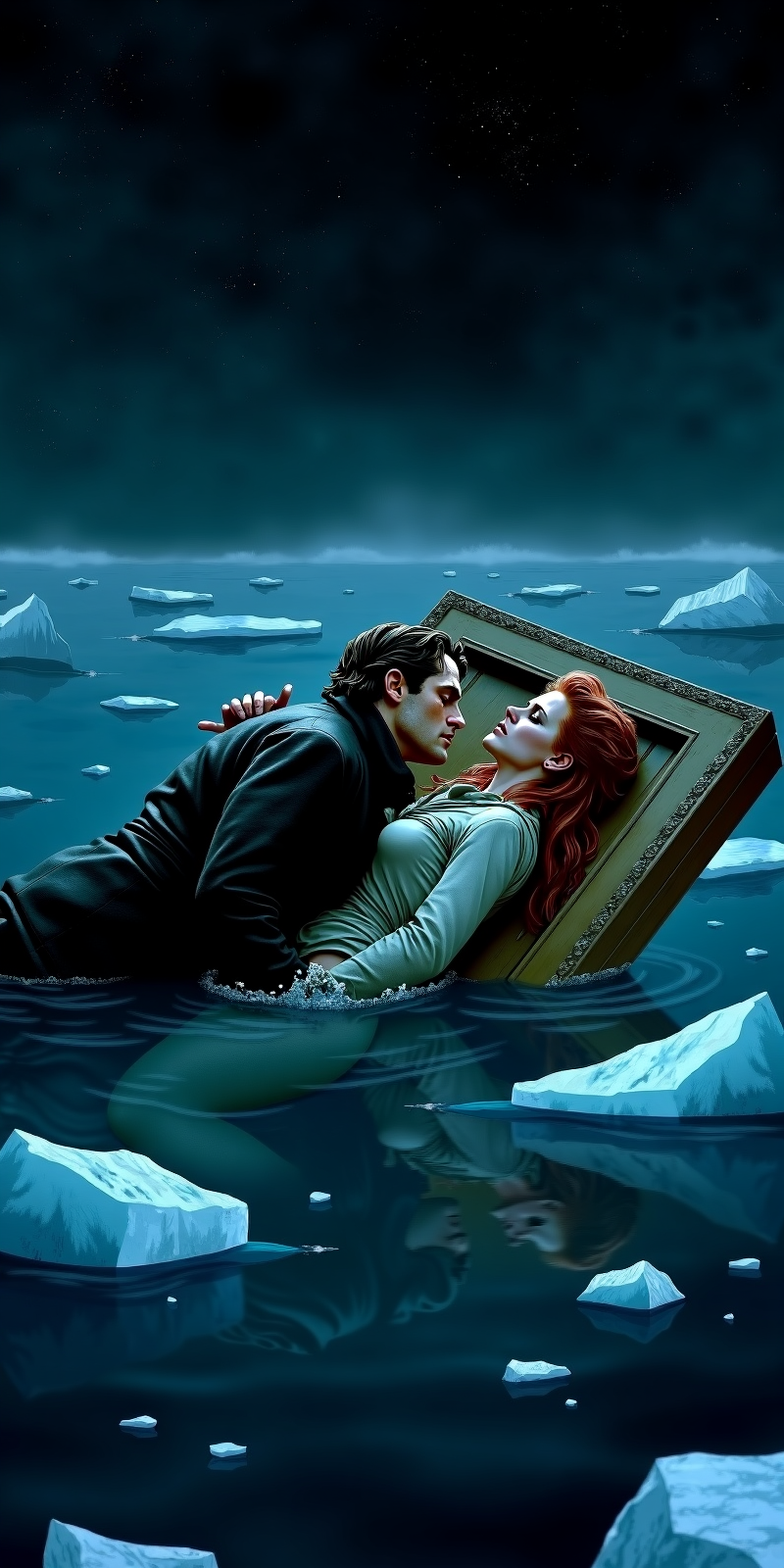Create a detailed image of the iconic scene from Titanic, but with the roles reversed: Jack is lying on the floating door, while Rose is in the icy water beside him. Jack is positioned on the door, looking cold but somewhat more secure, with a mix of concern and sadness in his eyes as he looks down at Rose. Rose, in the water, appears shivering and struggling to hold on, her expression filled with desperation and longing. The freezing ocean surrounds them, with floating ice and the dark, starry sky overhead. The overall atmosphere is tragic and emotional, capturing the heartbreak and tension of the moment but with the roles swapped to give a fresh perspective on the classic scene.
