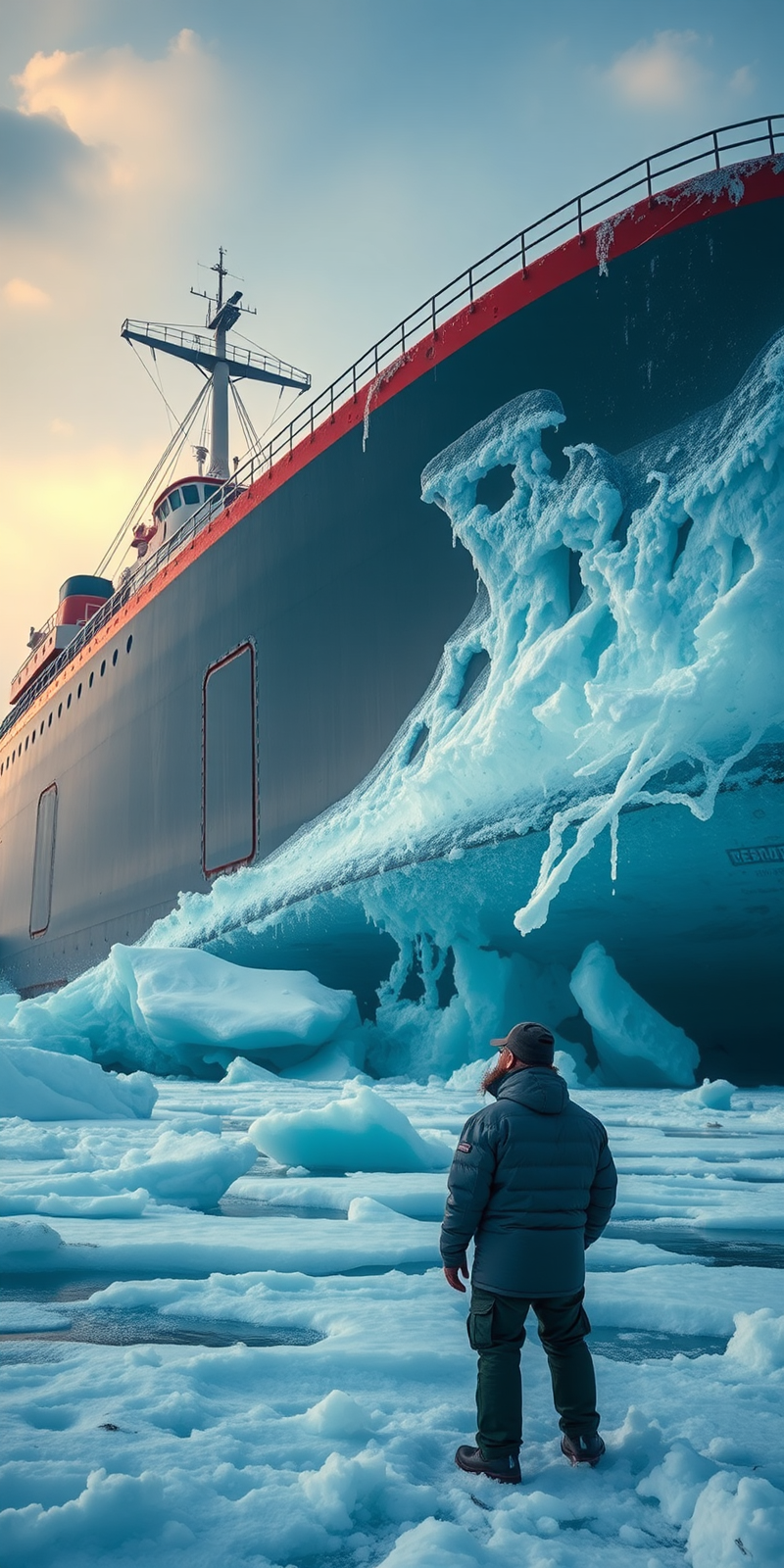 fisherman gazes up at a colossal icebreaker ship that is captured in ice. The scene unfolds with meticulous attention to detail: the imposing size of the ship looming. This mesmerizing photograph radiates with vivid colors and sharp contrast. the atmosphere is depressing with no hope for rescue. The high resolution of the image accentuates every intricate element, from the intricate ice to rust on the ice breaker ship. Wide range of colors., Dramatic,Dynamic,Cinematic,Sharp details Insane quality. Insane resolution. Insane details. Masterpiece. 32k resolution.detailxl
