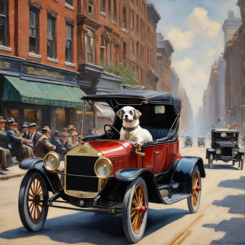 Oil painting, masterpiece, regal, fancy. A well-dressed dog named Puproy Doggerson III drives a Model T automobile cautiously down a bustling city street in 1920.