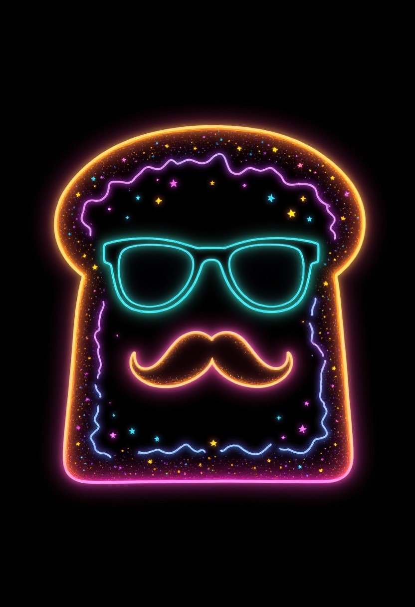 neon outline on black, neon colors, A pair of sunglasses and a mustache drawn on a slice of bread, with the caption: "Bread-y for anything with my disguise." Absurdres, ultra realistic, professional lightning many details, extreme detailed, full of details detailmaximizer,midjourneyv6.1
