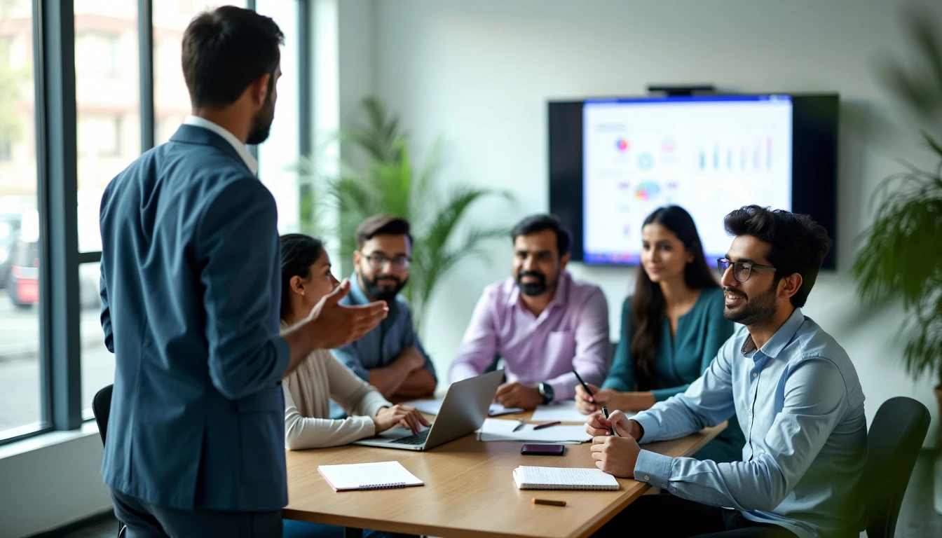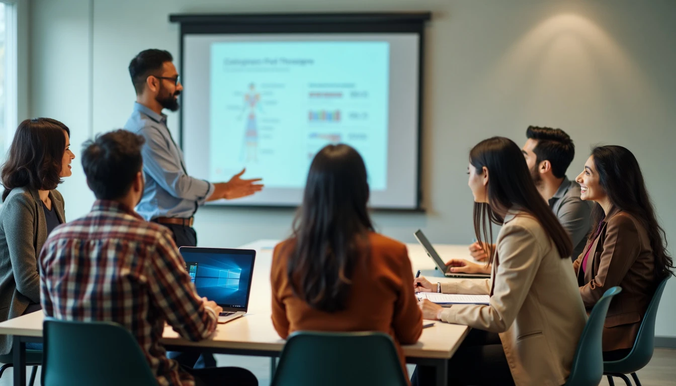 A realistic image of five indian individuals, seated in a modern, brightly lit office space, attentively participating in a training session. They are dressed in a mix of casual and smart indian attire, taking notes on notepads and laptops. The presenter stands at the front, gesturing towards a large screen displaying a presentation slide. The scene is captured with a smartphone's back camera, using natural light to highlight the engaged expressions and collaborative atmosphere. do not create bad anatomy